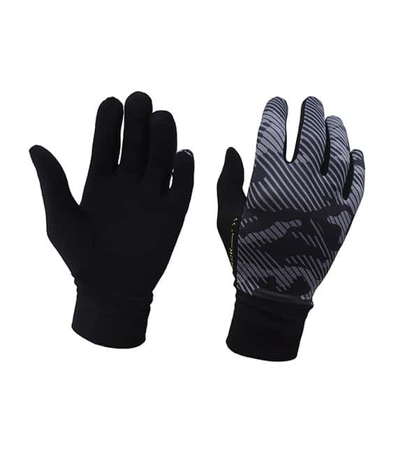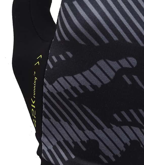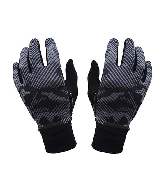 Guanti sportivi neri e grigi ideali per la corsa, elastico che facilita l’adattamento alla mano, lato anteriore in stile mimetizzato con retro nero.