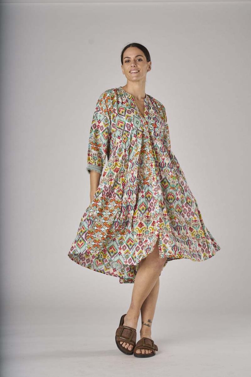 La vivace fantasia atzeca, la scollatura coreana aperta impreziosiscono l’abito Tangeri: perfetto per animare il tuo guardaroba! Maniche 3/4 con volant– Aperto con balze e tasche – Scollo a V profondo– 100% Cotone