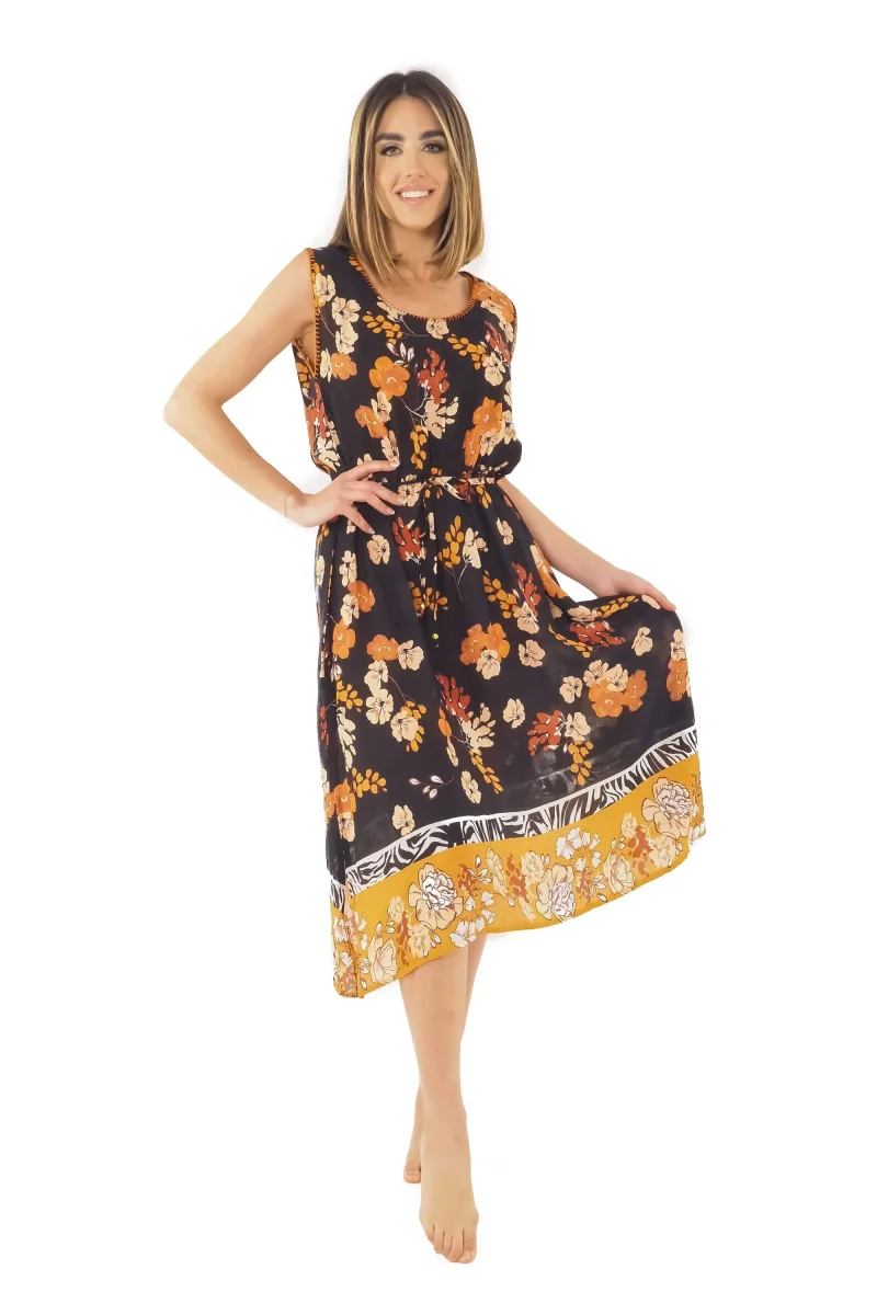 Aggiungi personalita’ e romanticismo ai tuoi outfit con l’abito Dora, disponibile in una raffinata fantasia floreale. – Scollo rotondo– Smanicato– Midi– Laccetto in vita– 100% Viscosa