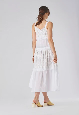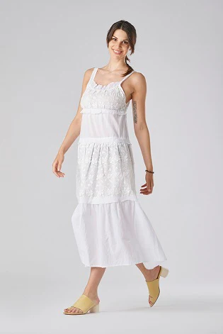 Abito a spalla larga costruito con 3 balze. Tessuto in puro cotone con fiori applicati. 100% cotone. Si ricordi che, vista l’artigianalità di questo articolo che li rendi unici tra di loro, il capo che si riceverà potrà variare in qualche piccolo dettaglio.