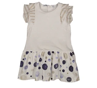 Proposta Melby collezione baby. Vestina in puro cotone jersey stretch. Modello girocollo con manica ad aletta in tessuto naturale e balza in fantasia planetario.