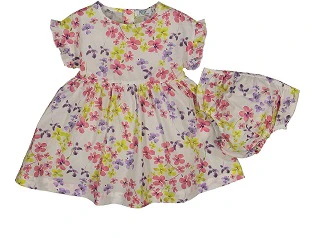 Proposta Melby collezione baby. Vestina in puro cotone batista. Modello girocollo con manica larga, realizzato in fantasia fiorellino provenzale.