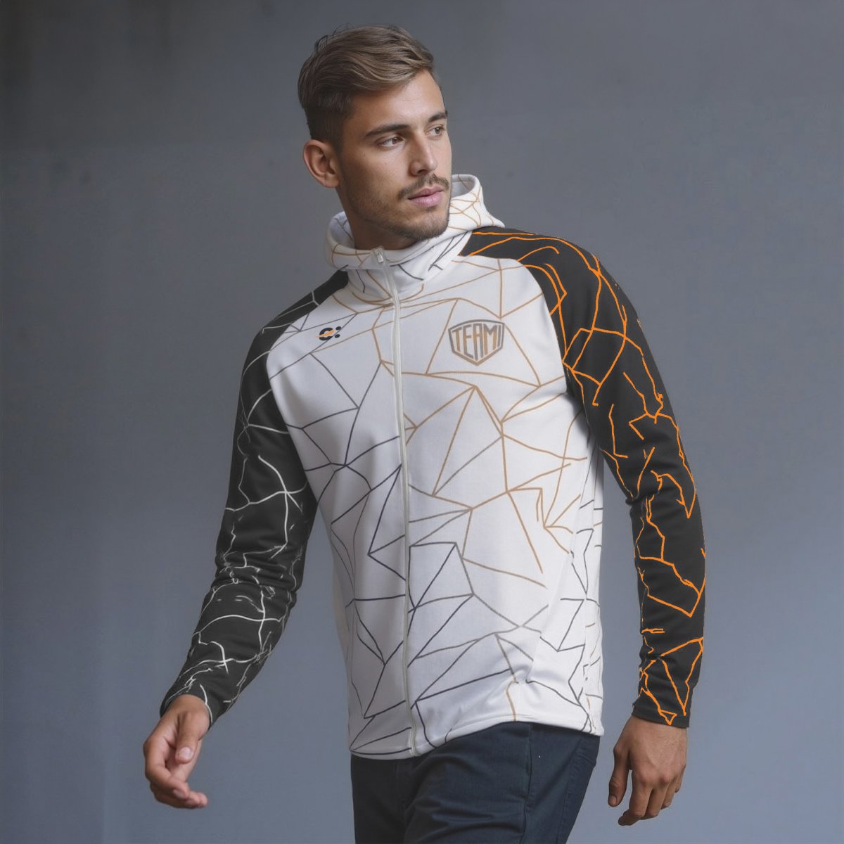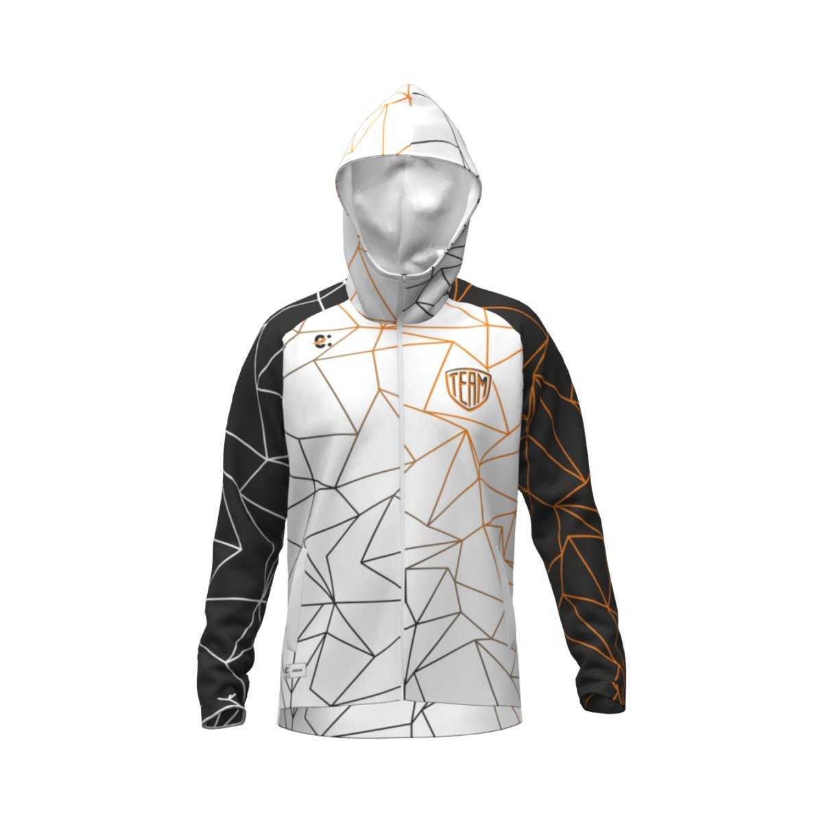 Giacca tuta full zip unisex in sublimazione. Maniche raglan. Tessuto elasticizzato leggermente garzato idoneo a tutte le stagioni. Vestibilità slim. Cappuccio con collo alto senza laccio. Tessuto: Puma. 85% Poliestere 15% Elastane. 260 grammi. Taglie: da 7XS a 5XL