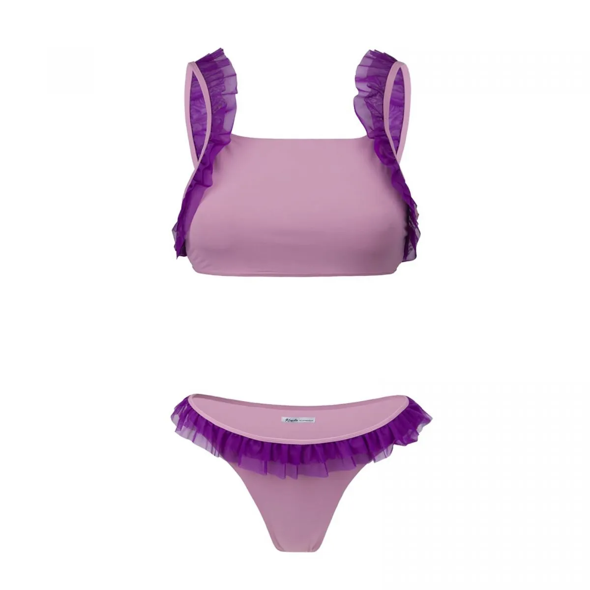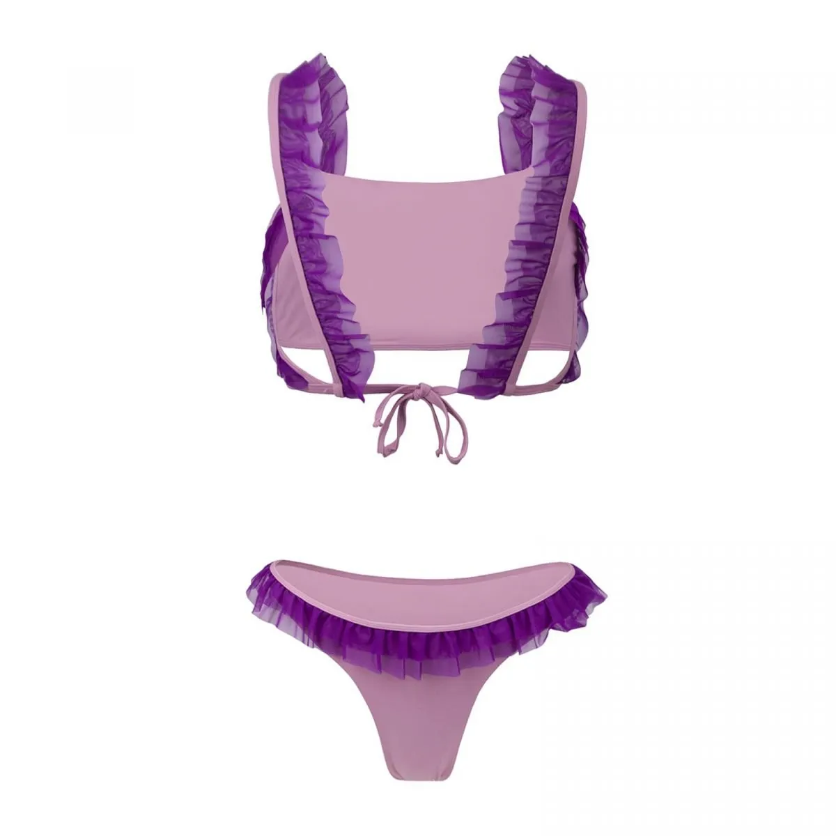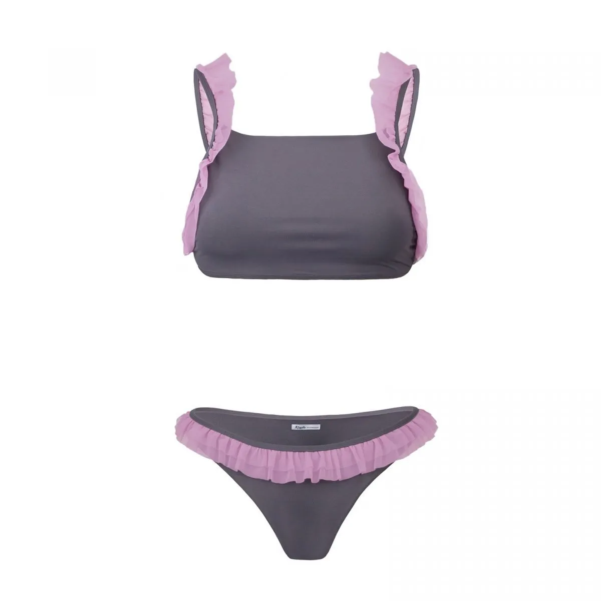 Bikini con top scollo all’americana e slip a vita bassa. Con rouches in tulle a contrasto.