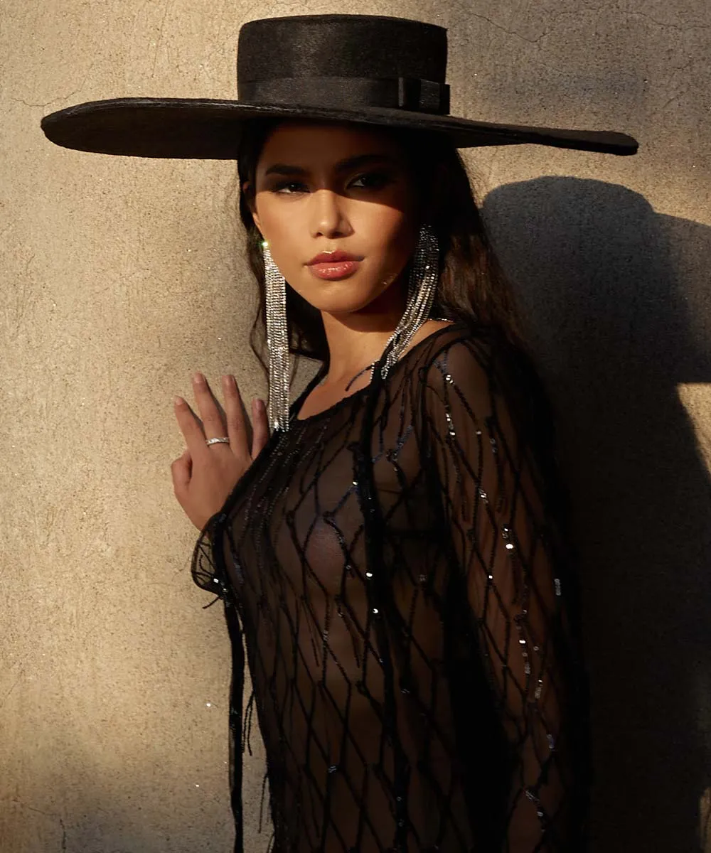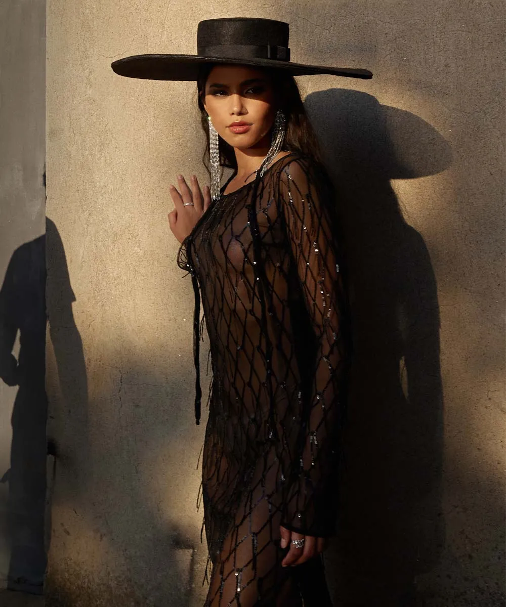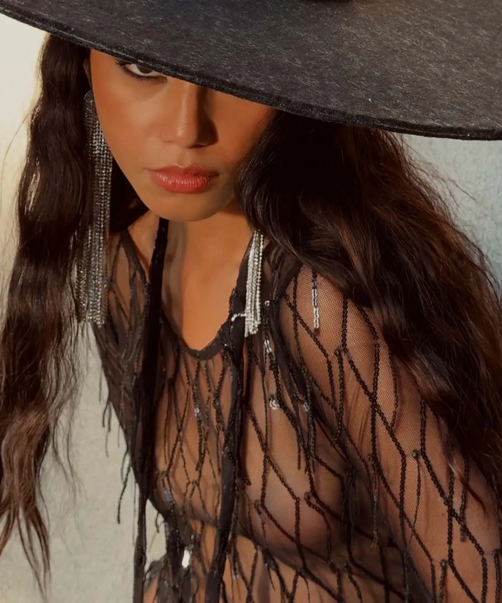 L’abito nero in rete trasparente per le tue serate glam in riva al mare o a bordo piscina. Cintura elastica removibile.