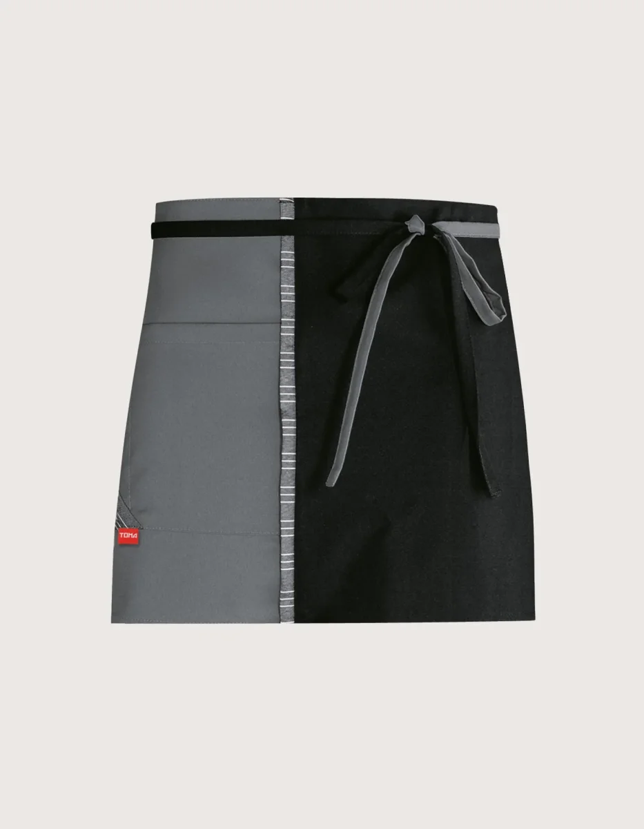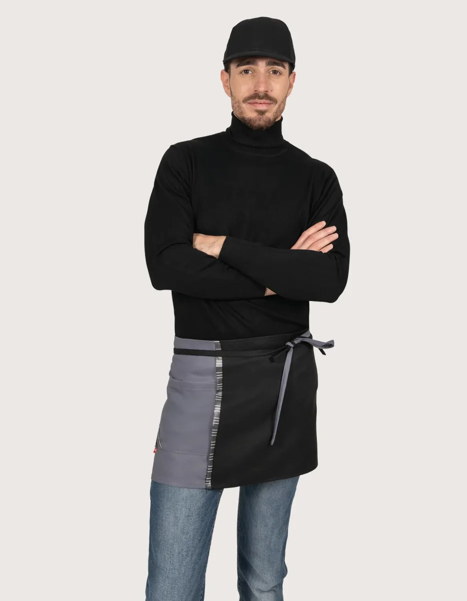 Grembiule unisex corto per addetti al servizio di sala e bar, 90×35, grigio-nero. Caratteristiche: tessuto 100% poliestere; tasca laterale; possibilità di annodare i lacci in vita. Lavaggio garantito fino a 50 gradi. Prodotto 100% Made in Italy. Può essere utilizzato come grembiule da servizio nei ristoranti, pub, bar e pasticcerie.