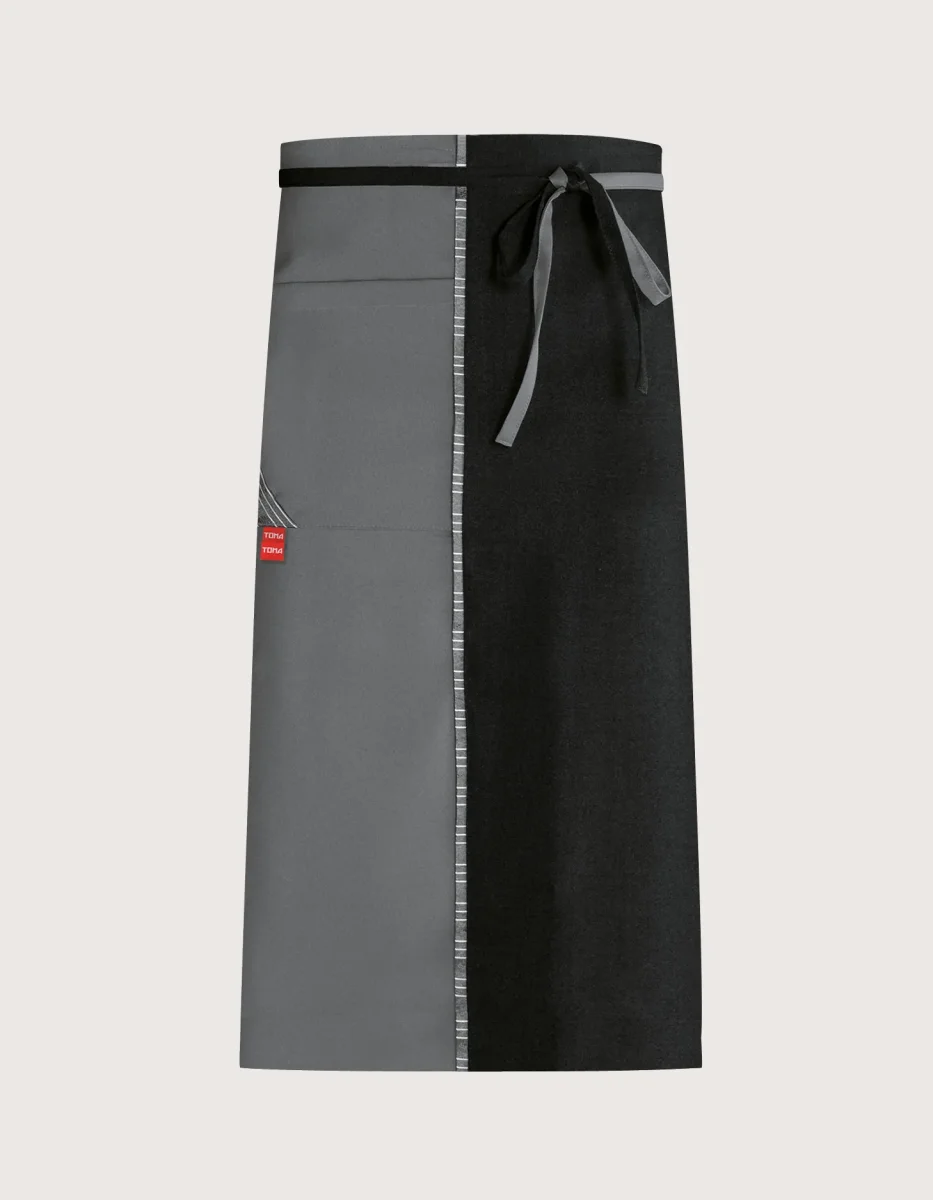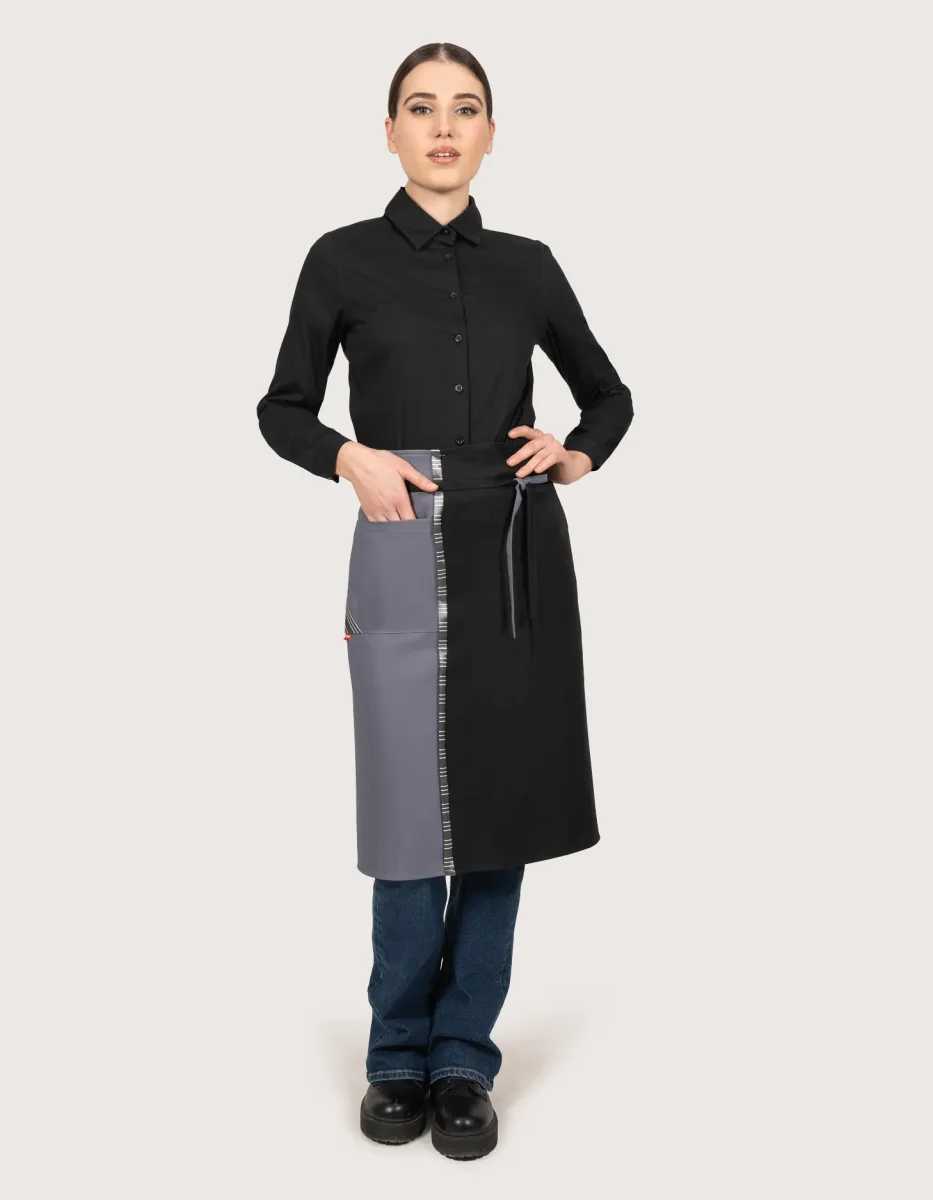 Grembiule unisex per addetti al servizio di sala e bar, 85×65, grigio-nero. Caratteristiche: tessuto 100% poliestere; tasca laterale; possibilità di annodare i lacci in vita. Lavaggio garantito fino a 50 gradi. Prodotto 100% Made in Italy. Può essere utilizzato come grembiule da servizio nei ristoranti, pub, bar e pasticcerie.