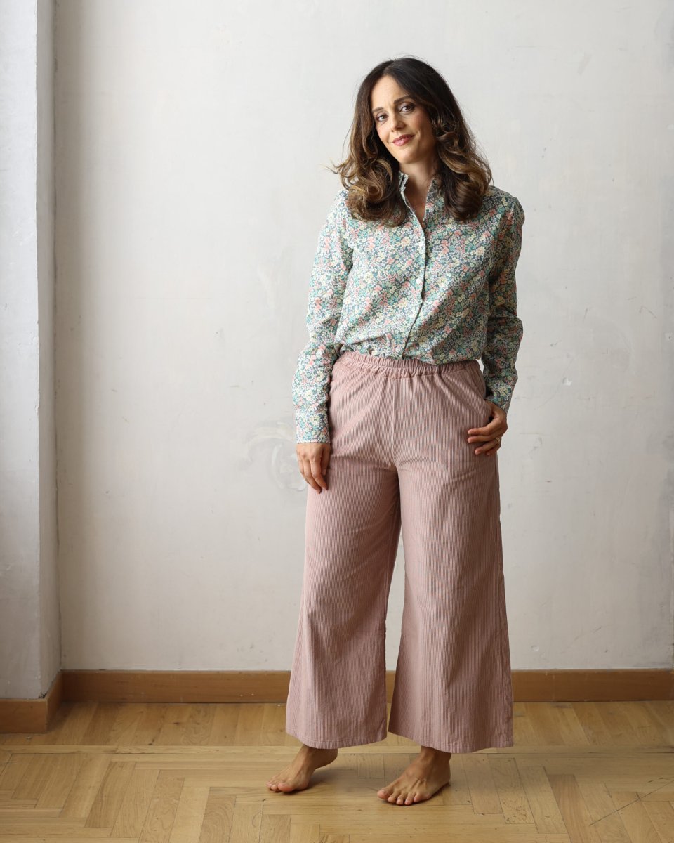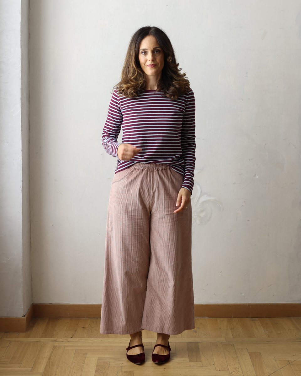 Crop ovvero pantalone da portare 4 dita sopra il malleolo, elastico in vita, forma comoda e particolare. Tessuto: il nostro classico velluto 500 righe super morbido   Laura è alta 173 cm, pesa 64 kg e veste la taglia M misure: vita 91 fianchi 107