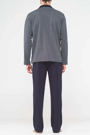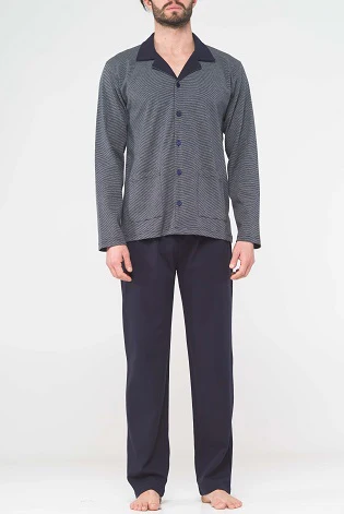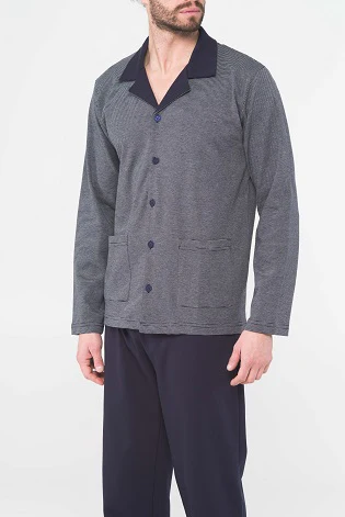 Pigiama lungo uomo aperto in morbido interlock tinto in filo di puro cotone. Maglia cardigan petto bavero MAGLIA CARDIGAN IN FANTASIA MILLERIGHE PANTALONI LUNGHI TINTA UNITA SENZA POLSINI TASCHE APPLICATE SULLA GIACCA RAFFINATO CONFORT COMPOSIZIONE : 100% COTONE