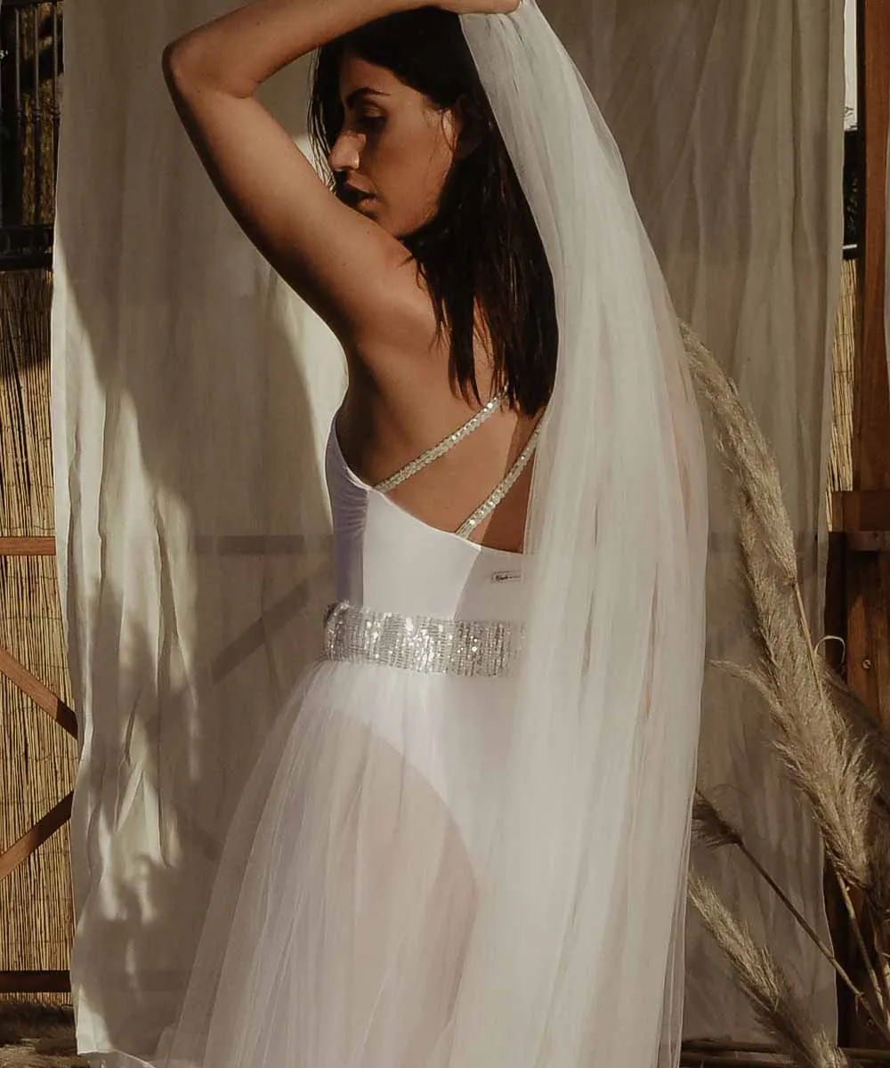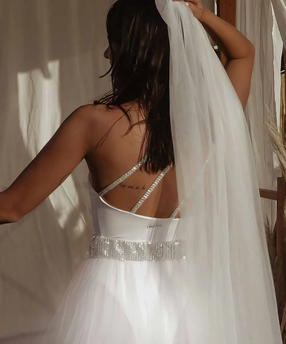 Étoile è l’elegante costume intero monospalla da sposa impreziosito da bretelline in micro-paillettes.