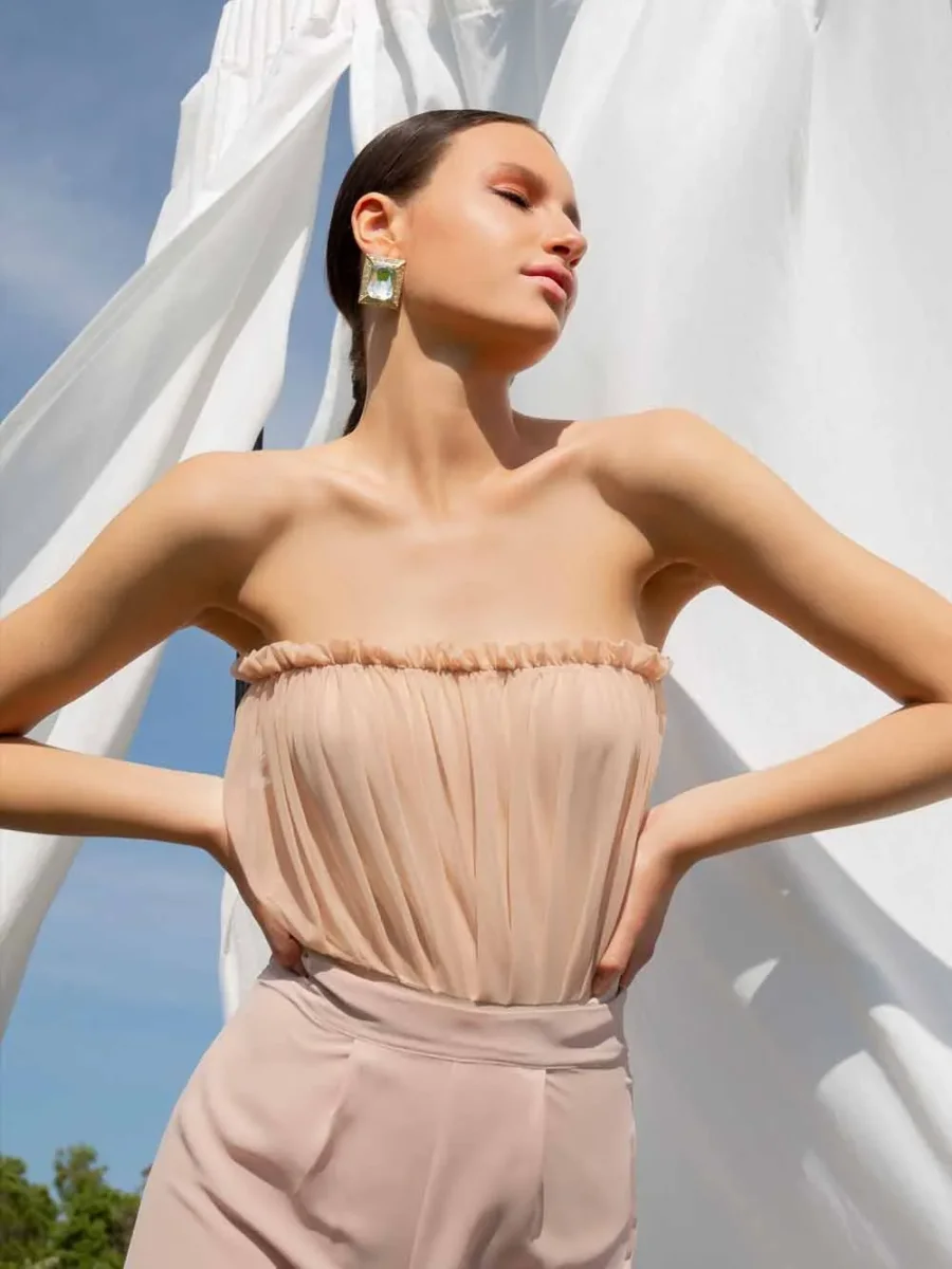 Costume da bagno intero senza spalline, realizzato in tulle morbidissimo plissettato e arricciato a mano in 3D, la nostra firma.