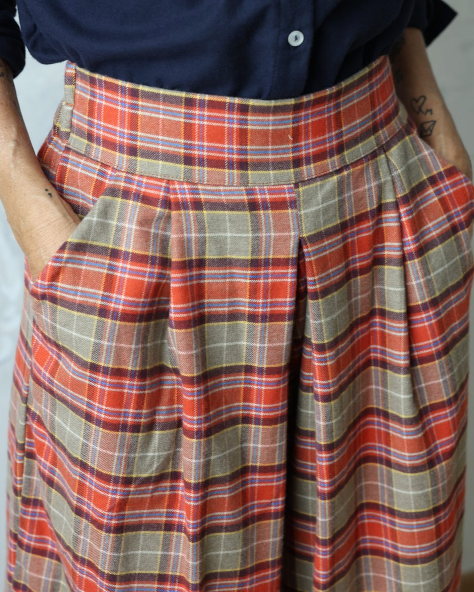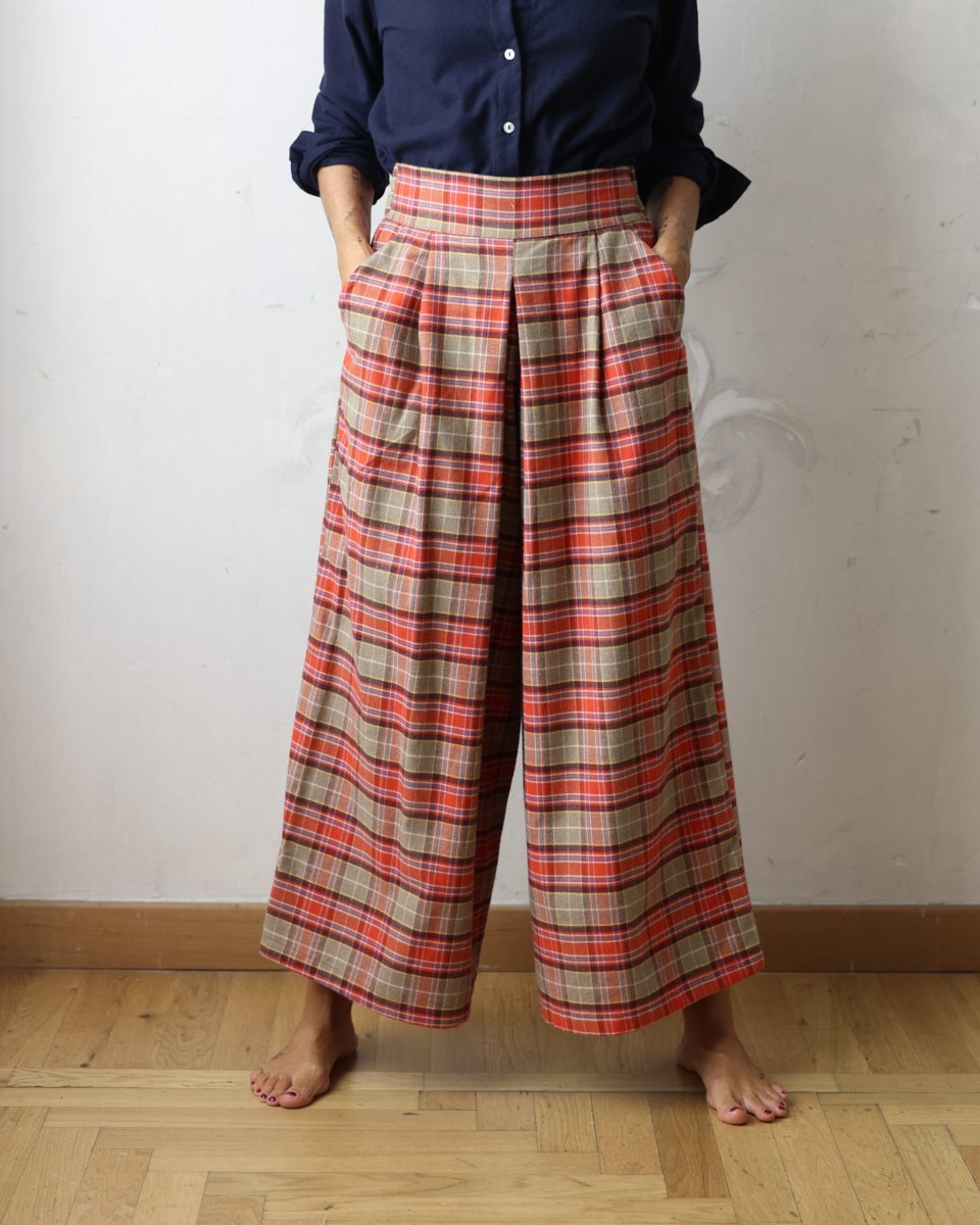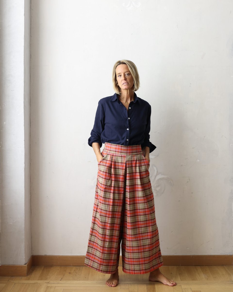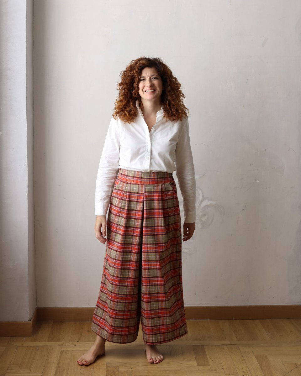Amo molto le gonne pantalone perché sono versatili: perfette per ufficio e tempo libero ma anche per serate con gli amici. La fascia in vita è fissa davanti ma dietro ha un elastico arricciato molto comodo. Gamba ampia che regala un bellissimo movimento. Perfette con mocassini, sneakers e tacchi alti. Vestibilità: giusta e comoda su fianchi e gambe. Tessuto: flanella di cotone peso medio/pesante. Una nota sui quadri: sono volutamente non appaiati. Questo perché renderli perfettamente simmetrici significherebbe un grande spreco di tessuto e una manodopera maggiore cha farebbe notevolmente aumentare il costo finale Amata è alta 171 cm,…