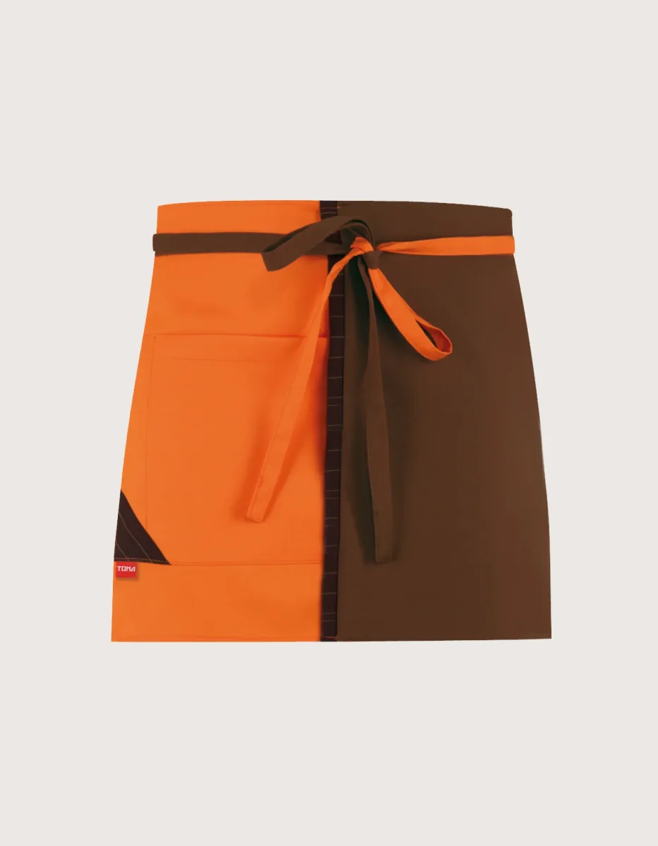 Grembiuli “Roger” senza pettorina in doppio colore marrone-arancio per addetti al servizio di sala, dim. 90×35 H. La confezione contiene 2 pezzi. Caratteristiche: unisex & taglia unica, tessuto 100% poliestere, tasca laterale e lacci da annodare in vita. Eleganti e pratici possono essere lavatati a 50° C, si asciugano rapidamente e sono facili da stirare, perfetti come grembiule da servizio nei ristoranti, pub, bar e pasticcerie. Abbigliamento professionale per la ristorazione. Prodotto da Toma Youniform, 100% Made in Italy.