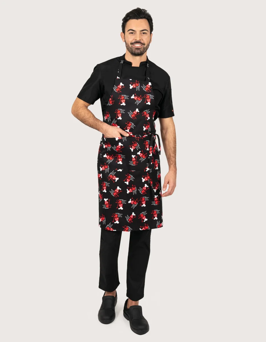 Grembiule lungo unisex per chef/cuoco, 70×95, nero con fantasia “Diavoletto”. Tessuto 100% cotone; ampia tasca centrale divisa in due scomparti; collo regolabile con velcro e lacci da annodare in vita. Lavaggio garantito fino a 60 gradi. Prodotto 100% Made in Italy, ideale per cucine professionali, ristoranti, pizzerie e pasticcerie. Disponibile anche nelle altre fantasie: Cucina, Italia, Supereroi, Game Over, Giornale, Teschio e Black & White; tessuti gessati: gessato nero e blu; colori tinta unita: nero, blu, grigio, verdone.