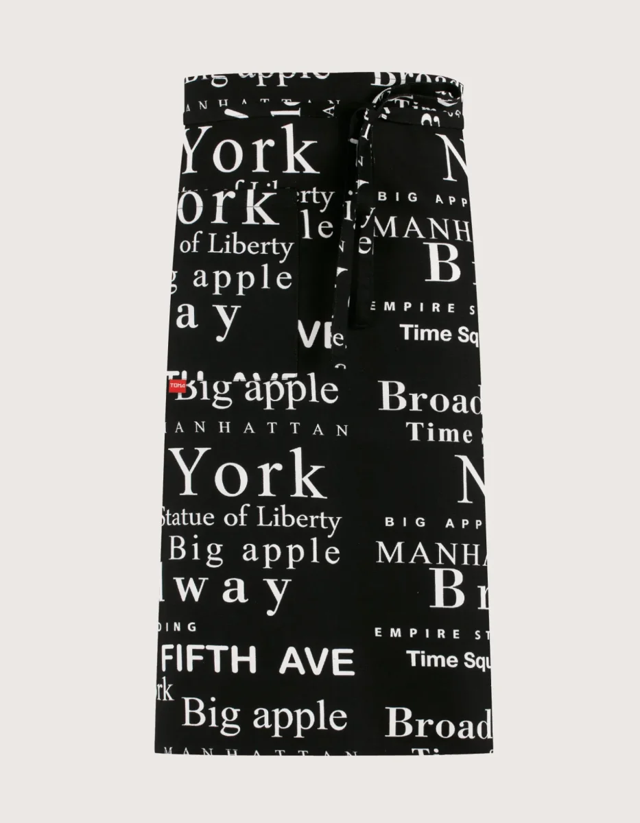 Coppia di grembiuli unisex per chef/cuoco, 85×65, nero con fantasia “New York”. Caratteristiche: tessuto 100% cotone, senza pettorina ma con utile tasca laterale e lacci da annodare in vita. Lavaggio garantito fino a 60 gradi. Prodotto 100% Made in Italy. Ideale per cucine di ristoranti, pub, laboratori alimentari e gastronomie. Disponibile anche nelle fantasie: Cucina, Italia, Supereroi, Game Over, Diavoletto, Giornale, Teschio, Black & White, in tessuti gessati: nero gessato e blu gessato e in tinta unita: nero, blu, grigio e verdone.