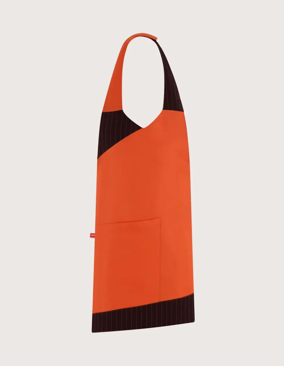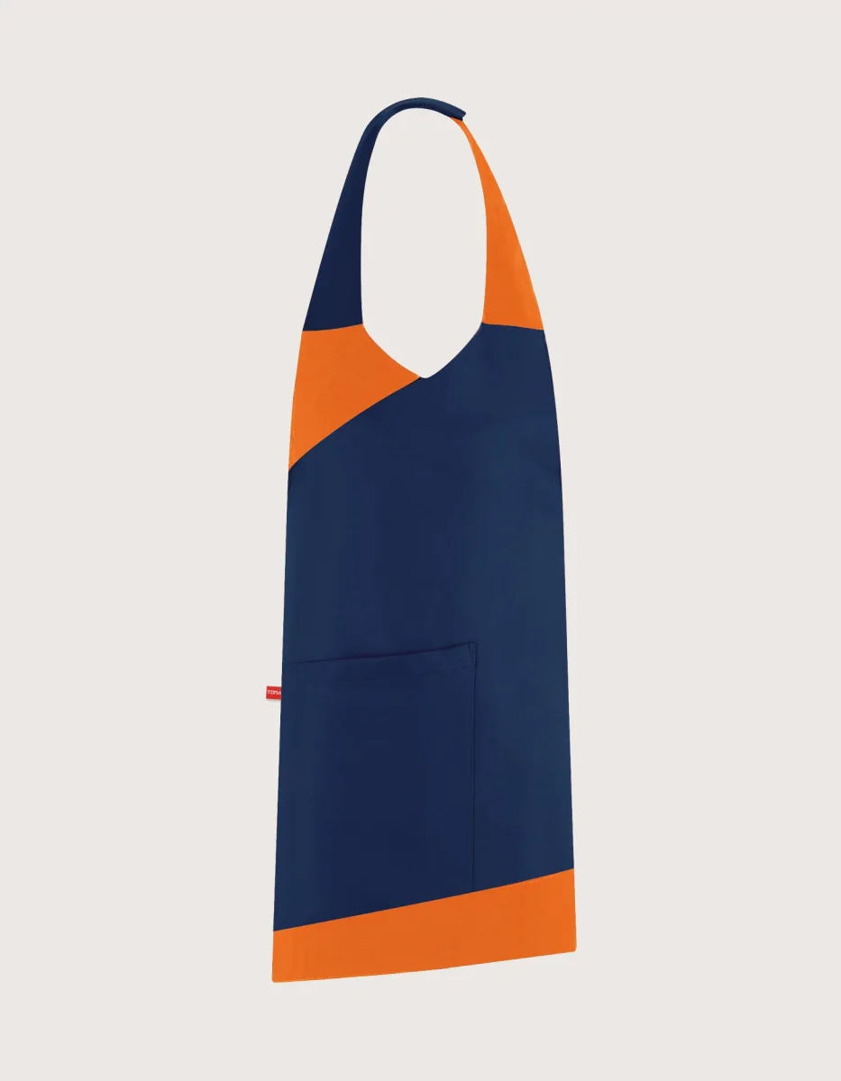 Grembiule Malta unisex con pettorina con colori a scelta. Blu con inserti in arancio o arancio con inserti tessuto gessato colore senape. Taglia unica, collo regolabile con velcro, tasca laterale e chiusura posteriore con lacci. Tessuto 100% poliestere, lavaggio garantito fino a 50 gradi. Si asciugano rapidamente e sono facili da stirare, perfetti come divisa per addetti al servizio di sala. La collezione di grembiuli Malta è disponibile anche in altre varianti di colore (link), tutti coordinabili con vari cappelli e accessori. Abbigliamento professionale per la ristorazione. Prodotto da Toma Youniform, 100% Made in Italy.