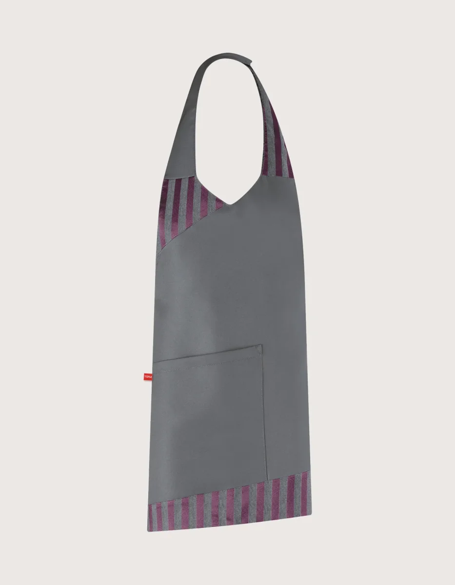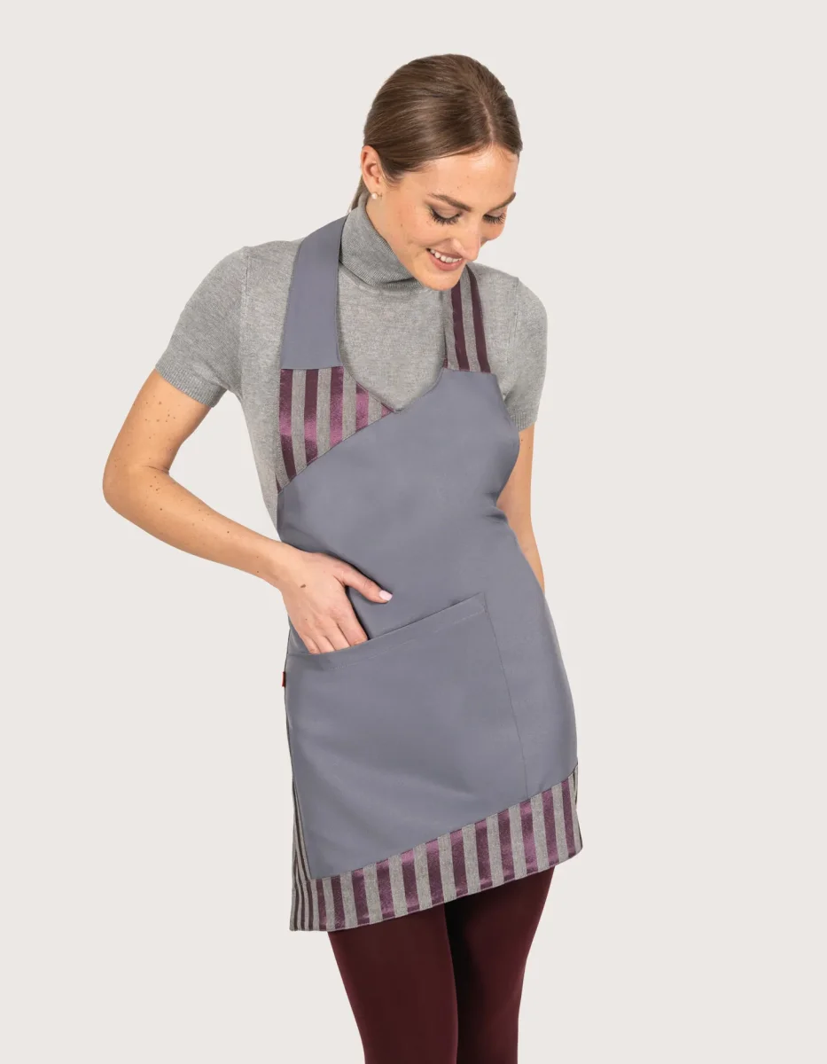 Grembiule unisex con pettorina in grigio con inserti riga viola.Taglia unica, collo regolabile con velcro, tasca laterale e chiusura posteriore con lacci. Tessuto 100% poliestere, lavaggio garantito fino a 50 gradi. La collezione di grembiuli Malta è disponibile anche in altre varianti di colore (link), tutti coordinabili con vari cappelli e accessori. Abbigliamento professionale per la ristorazione. Prodotto da Toma Youniform, 100% Made in Italy.