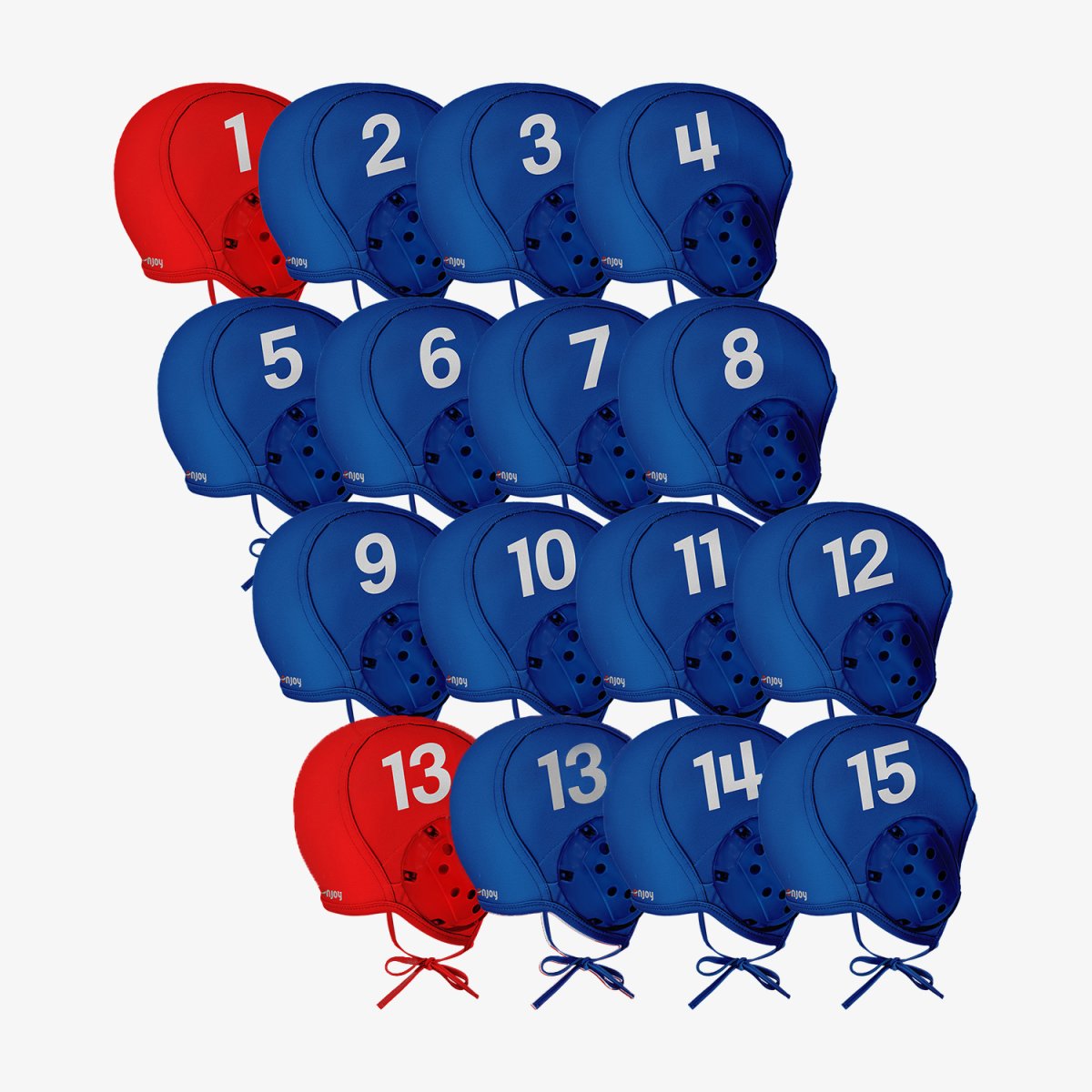 Set calottine monocolore da 16 pezzi. Numerazione: portieri 1 e 13 – giocatori di movimento 2 – 15. Paraorecchi in tinta. Laccio in tinta. Tessuto: Rugby. 100% Poliestere. 240 grammi. Taglie: Senior – Junior