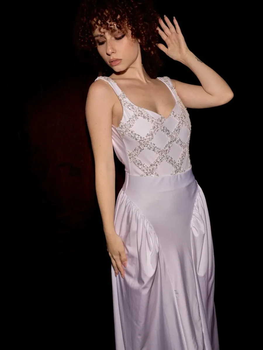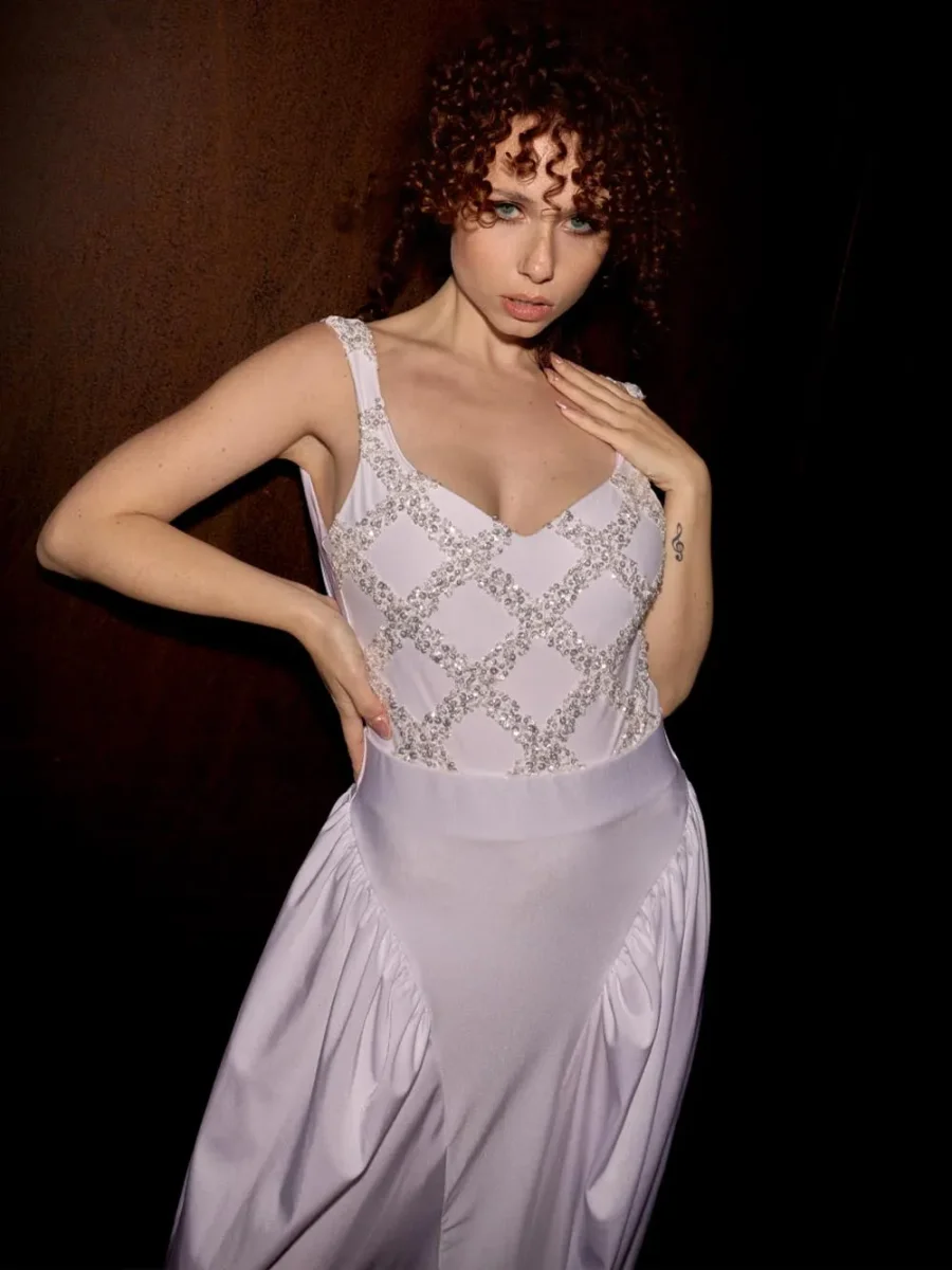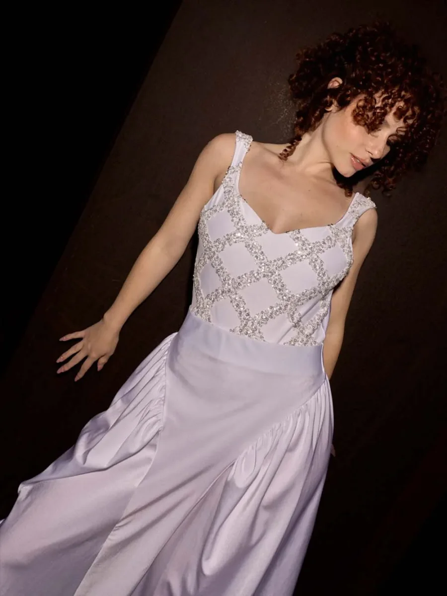 Gonna lunga da sposa realizzata in lycra bianca satinata, dalla mano morbida e luminosa che accarezza il corpo con naturalezza.