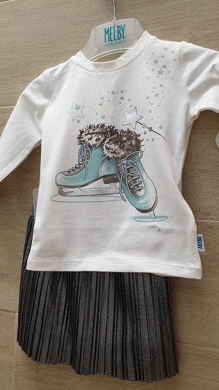 Grazioso completo Melby formato da maglietta in jersey e gonna in luccicante plissรจ. Stile trend per un coordinato simpaticissimo per un utilizzo frequente ma anche per occasioni piรน particolare, proprio nello stile di MELBY