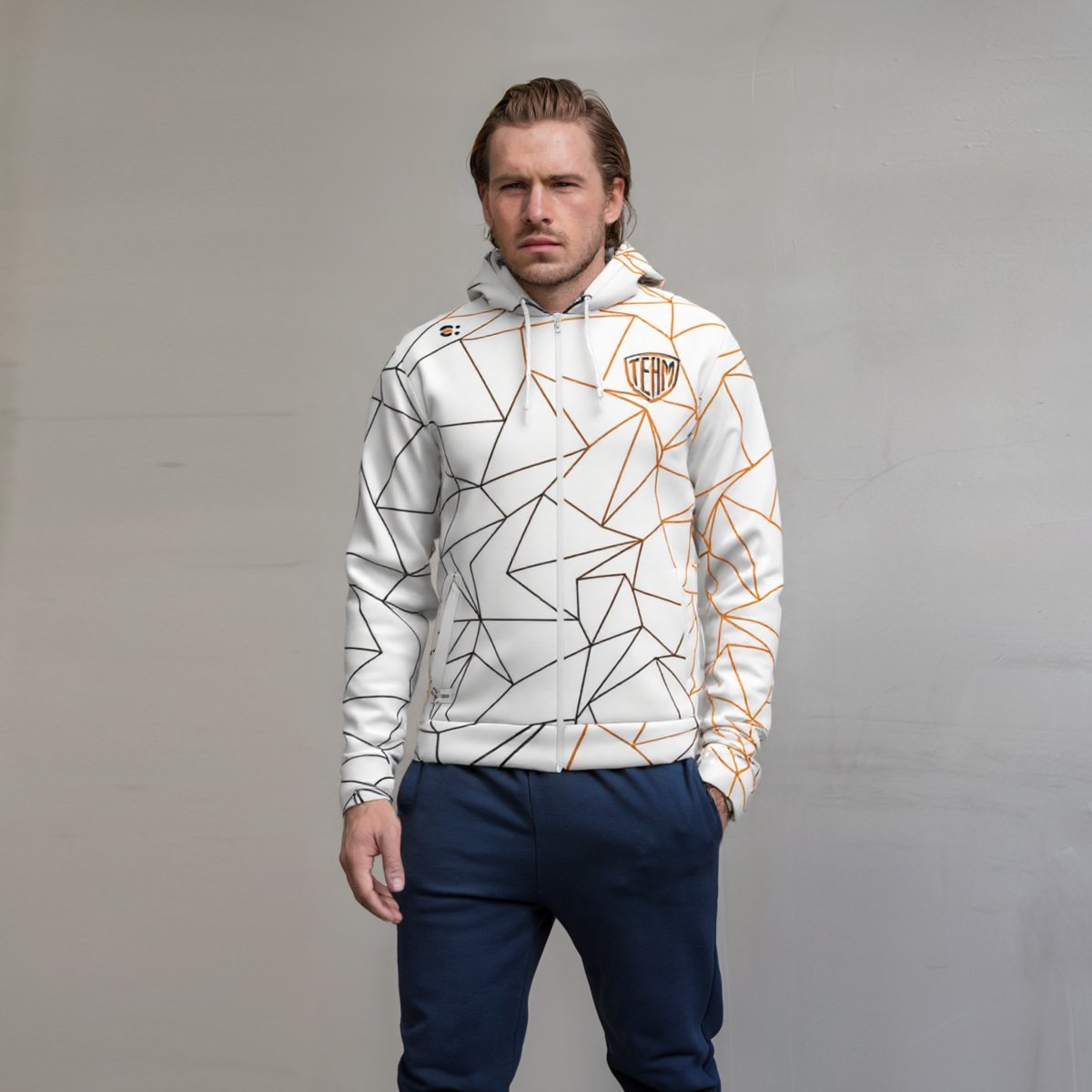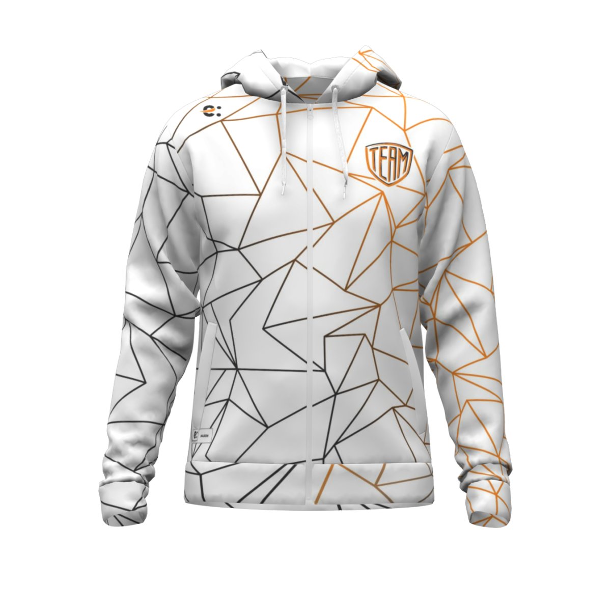 Giacca tuta zip e cappuccio in sublimazione. Unisex. Tessuto elasticizzato leggermente garzato idoneo a tutte le stagioni. Vestibilità slim. Polsi e cinta stampabili. Colore laccio cappuccio a scelta Tessuto: Puma. 85% Poliestere 15% Elastane. 260 grammi. Taglie: da 7XS a 5XL
