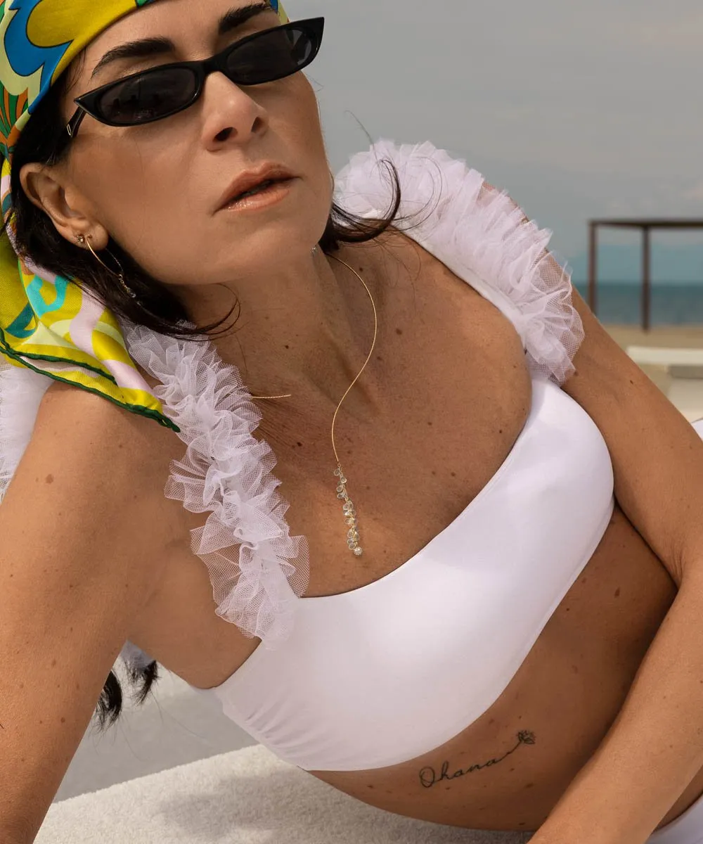 Bikini bianco in lycra rigenerata contenitiva opaca. Dall’addio al nubilato al viaggio di nozze, fino al matrimonio in spiaggia questo costume da sposa offre compressione e comfort per un look impeccabile. Con spalline in tulle semi-rigido lavorato in 3D, la nostra firma.