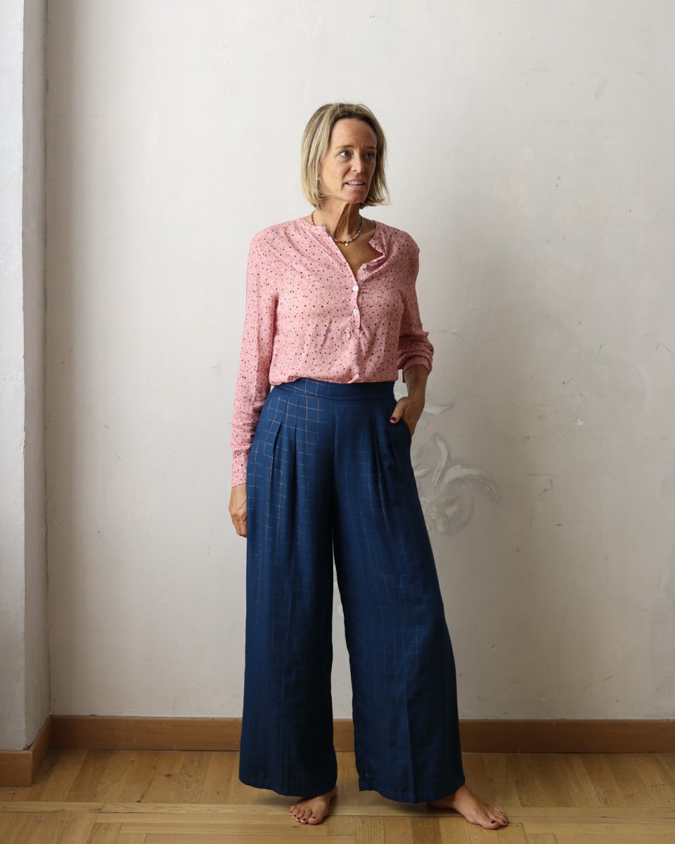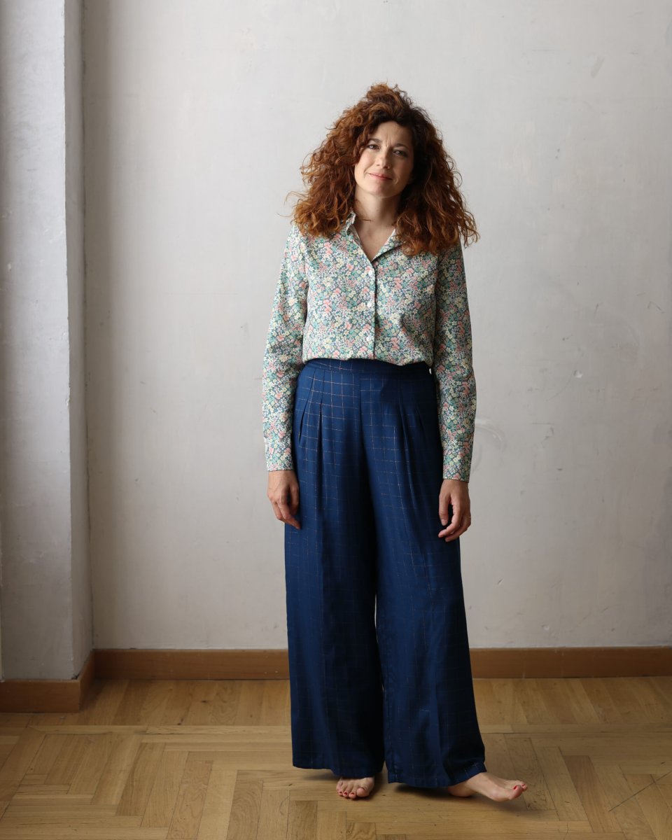 Un pantalone dalla forma super comoda: elastico posteriore, gamba dritta e morbida, pinces fissate in cima per non fare difetto “pancetta” ma che si aprono poi per dare movimento al capo. Cerniera laterale per aiutare la vestibilità che risulta comoda. Flanella di cotone leggera e molto fluida. Peso medio/leggero Amata è alta 171 cm, pesa 56 kg e veste la taglia S misure: 73 vita e 97 fianchi Veronica è alta 168 cm, pesa 53 kg e veste la taglia S misure: 78 vita e 96 fianchi