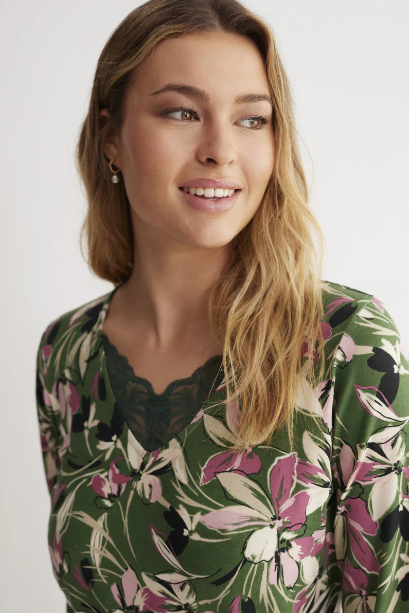 Idea donna realizzata in maglina di micromodal con casacca manica lunga scollo a V con pizzo.