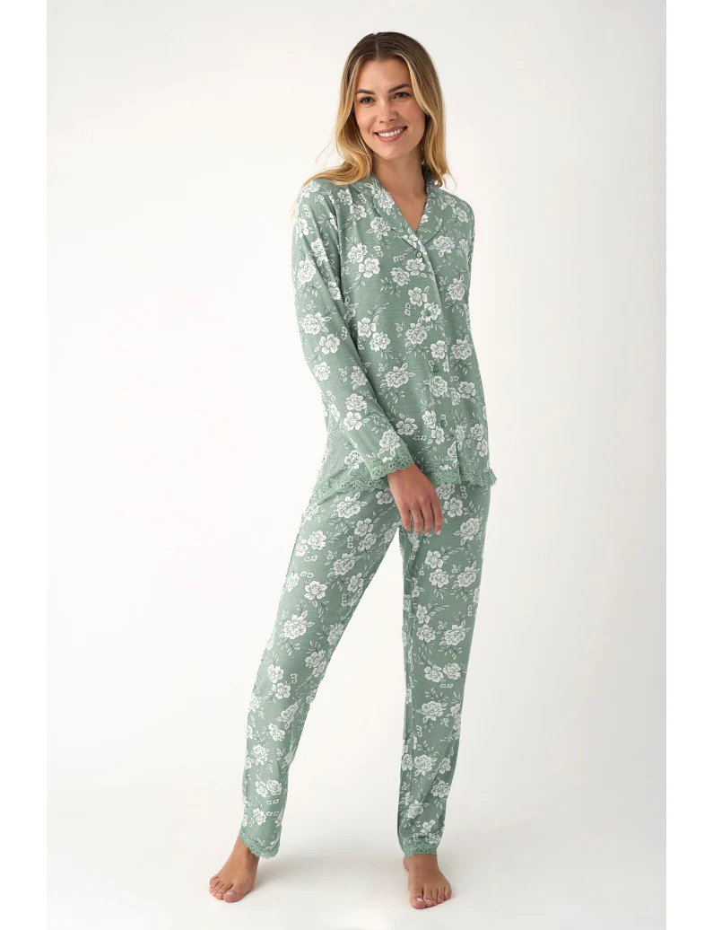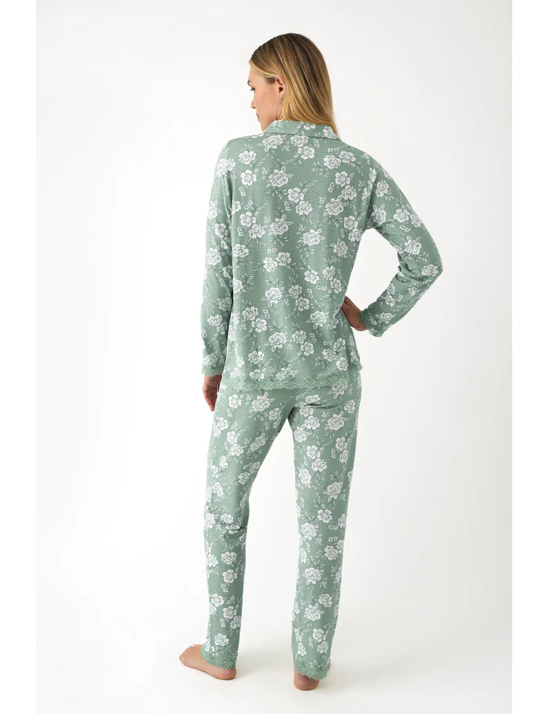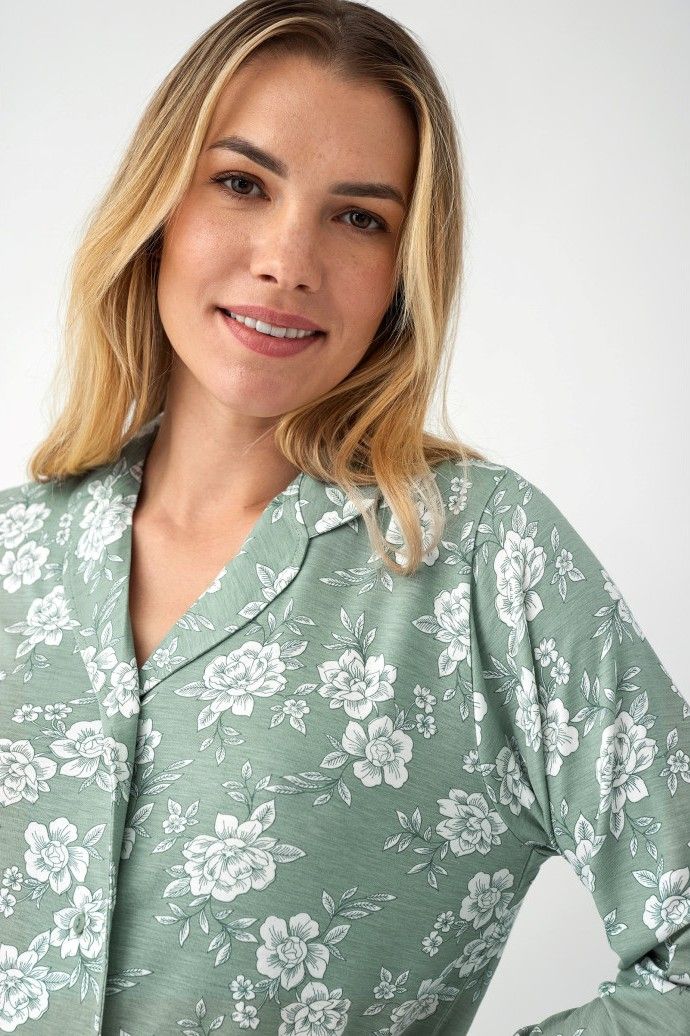 Pigiama Promise in viscosa leggera, con stampa floreale menta e dettagli con pizzo. Composto da t-shirt manica lunga con bottoni e pantaloni lunghi, per un look elegante e confortevole.