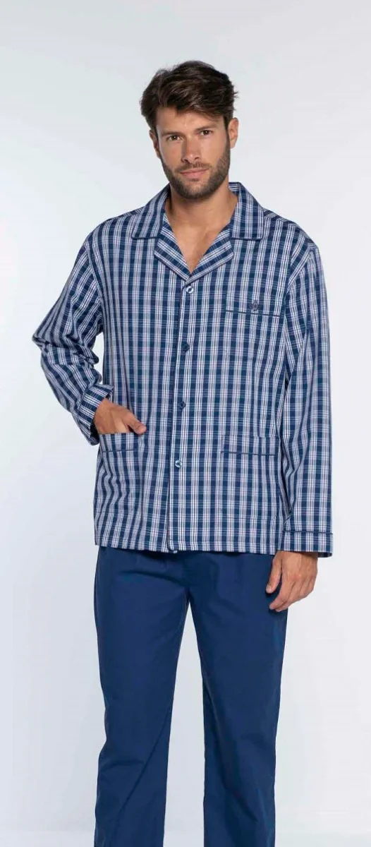 Proposta uomo collezione Guasch. Pigiama lungo aperto con collo. 100% cotone, rifiniture preziose, bottone madreperla, taschino a toppa.