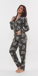 Pigiama donna collezione Gary. Fantasia esclusiva per un modello particolare. Pigiama Aperto con collo e tasche tipo uomo, realizzato in puro cotone 100% cosi come è 100% prodotto in Italia.