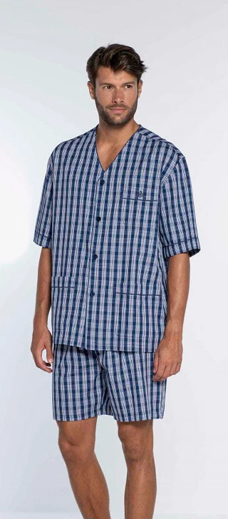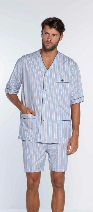 Proposta uomo by Guasch. Pigiama corto aperto realizzato in cotone batista. 100% fibra naturale, rifinito in modo prezioso e con taschino a toppa.