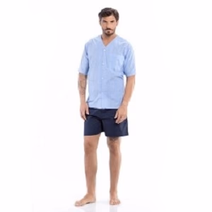 Pigiama aperto mezza manica senza collo pantalone corto, 100% cotone popeline irrestringibile, elastico rivestito di tessuto.