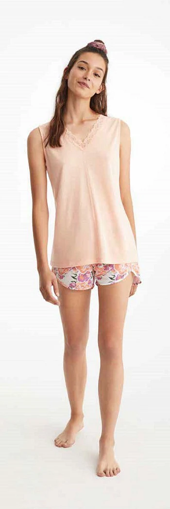 Pigiama estivo collezione Promise. Maglietta a spalla unita con pizzo e pantaloncino corto fantasia floreale.