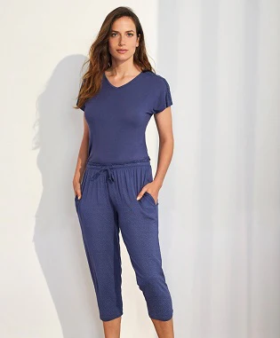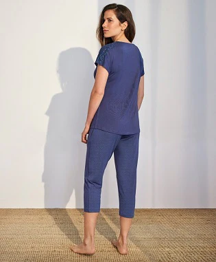 Casacca mezza manica in tinta unita con pizzo alle spalle, pantalone modello capri fantasia micropois rifinito con coulisse e tasche a filo.