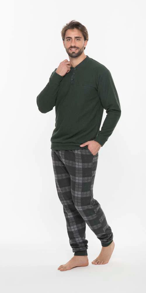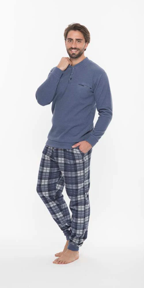 Pigiama Uomo serafino con 3 bottoni in punto milano 50% cotone e 50% poliestere, maglia tinta unita con taschino, pantalone fantasia geometrica a quadri rifinito con polsi.