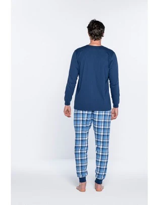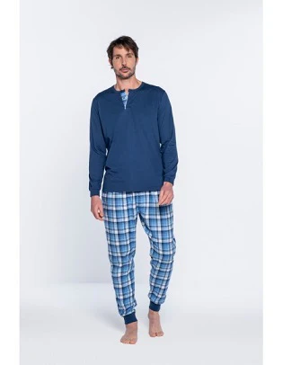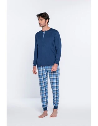 Pigiama uomo Guasch con casacca modello serafino tinta unita con inserti a quadri, pantalone in vaiella scozzase aperto con bottoni e coulisse rifinito con polsini alle caviglie