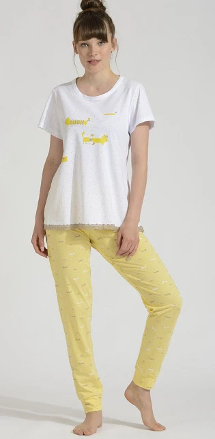 Pigiama donna serafino girocollo pantalone lungo fantasia bassotto maglietta mezza manica tinta unita in puro cotone.
