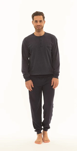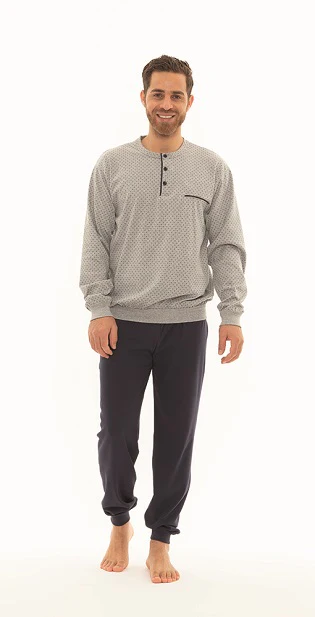 Pigiama uomo collezione Gary. Proposta in puro cotone 100% interlock. Maglia serafino con bottoni in fantasia cravatta. Pantaloni tinta unita con polsino. Made in Italy.