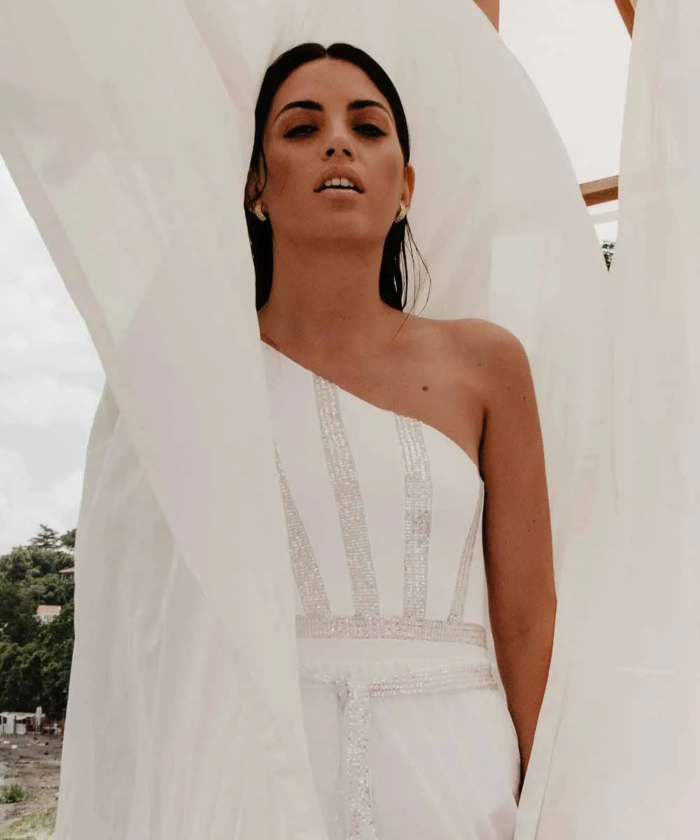 Costume da bagno da sposa realizzato in ECONYL®, un filato di nylon rigenerato a partire da ciò che non si usa più, come reti da pesca, tappi e scarti pre e post-industriali recuperati in tutto il mondo. E’ sostenibile poiché rigenerato e infinitamente rigenerabile! Un futuro migliore inizia da oggi.