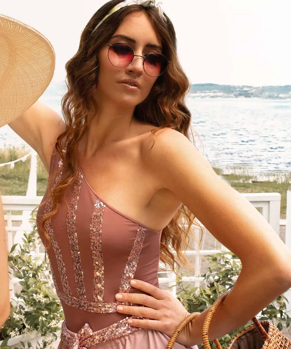 Costume intero monospalla con corpetto intarsiato di paillettes.