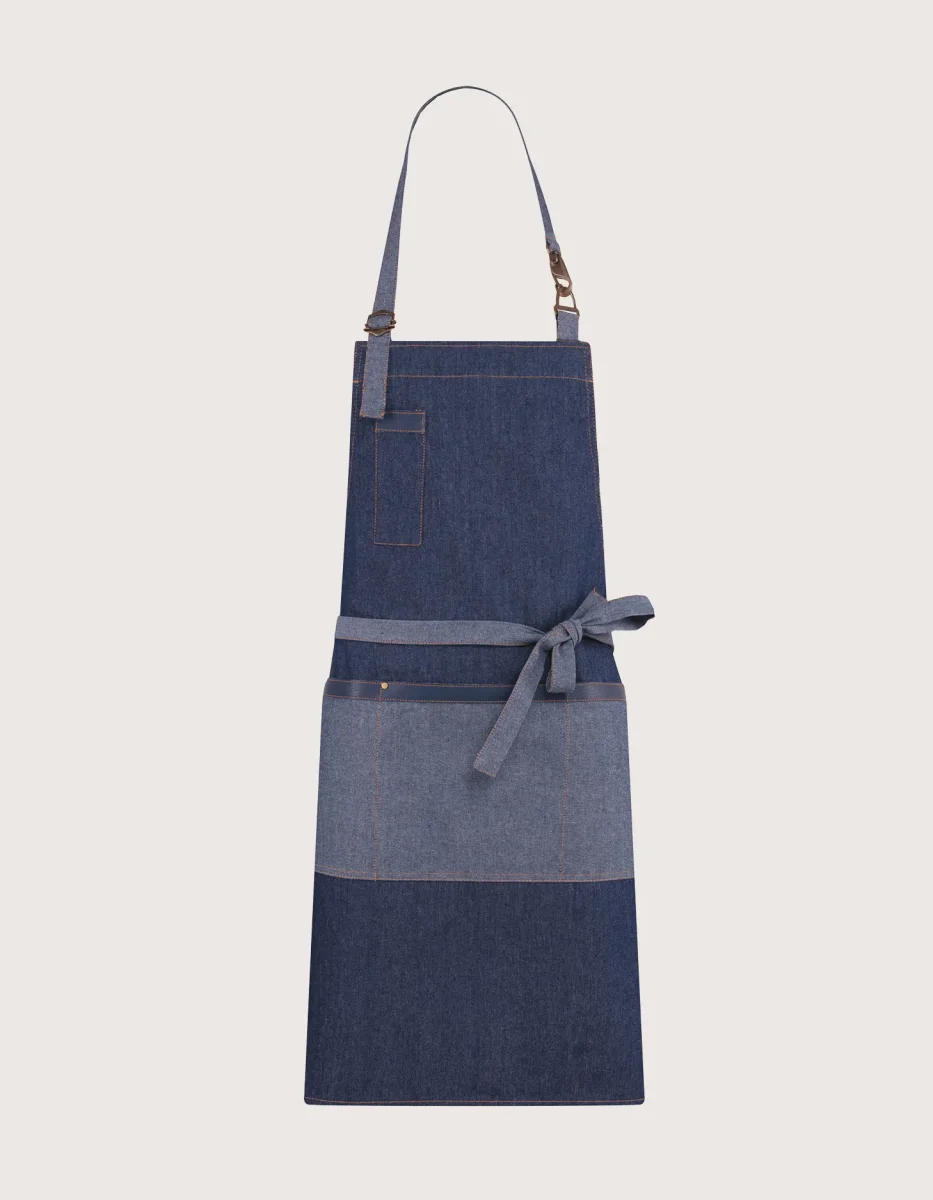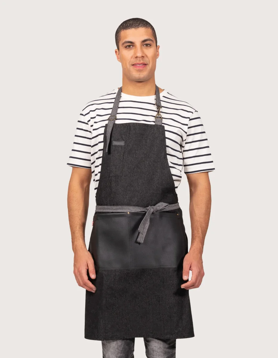 Grembiule lungo unisex per addetti al servizio di sala e bar, 70×85. Colori disponibili: nero o blu con inserti in eco pelle. Caratteristiche: tessuto 100% denim cotone; collo regolabile con fibbia; tasche: un ampia tasca centrale e una tasca porta penne sul petto; lacci girovita. Lavaggio garantito fino a 40 gradi. Prodotto 100% Made in Italy. Può essere utilizzato come grembiule da servizio nei ristoranti, pub, bar e pasticcerie.