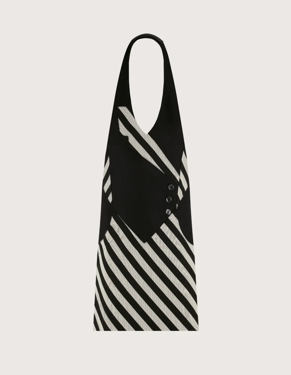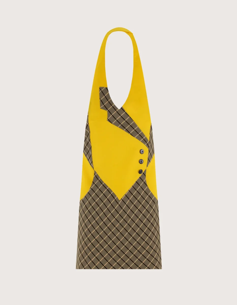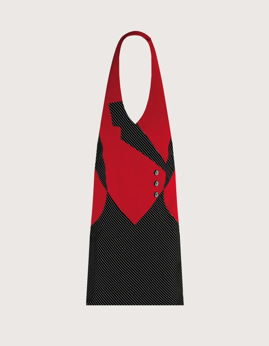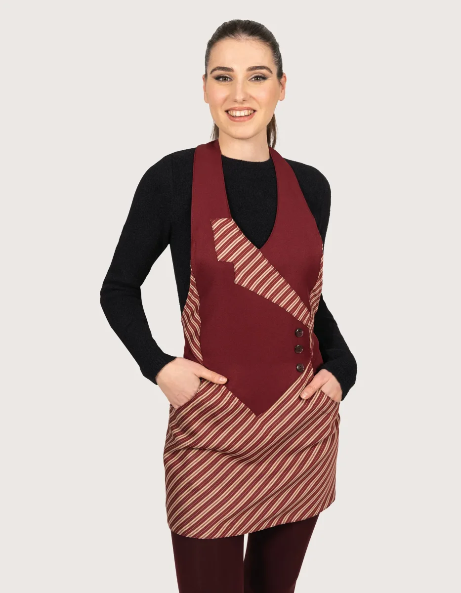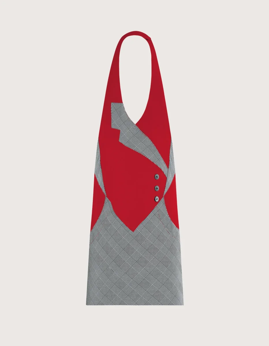 Panarea grembiule unisex con pettorina corto H 60 colori a scelta rosso con dettagli a contrasto: Principe di Galles o Nero Gessato. Elegante e creativo con una finta allacciatura con bottoncini. Taglia unica, collo regolabile con velcro, tasca laterale e chiusura posteriore con lacci. Tessuto 100% poliestere, lavaggio garantito fino a 50 gradi. Asciugatura rapida & facile da stirare, perfetti come divisa per addetti al servizio di sala.