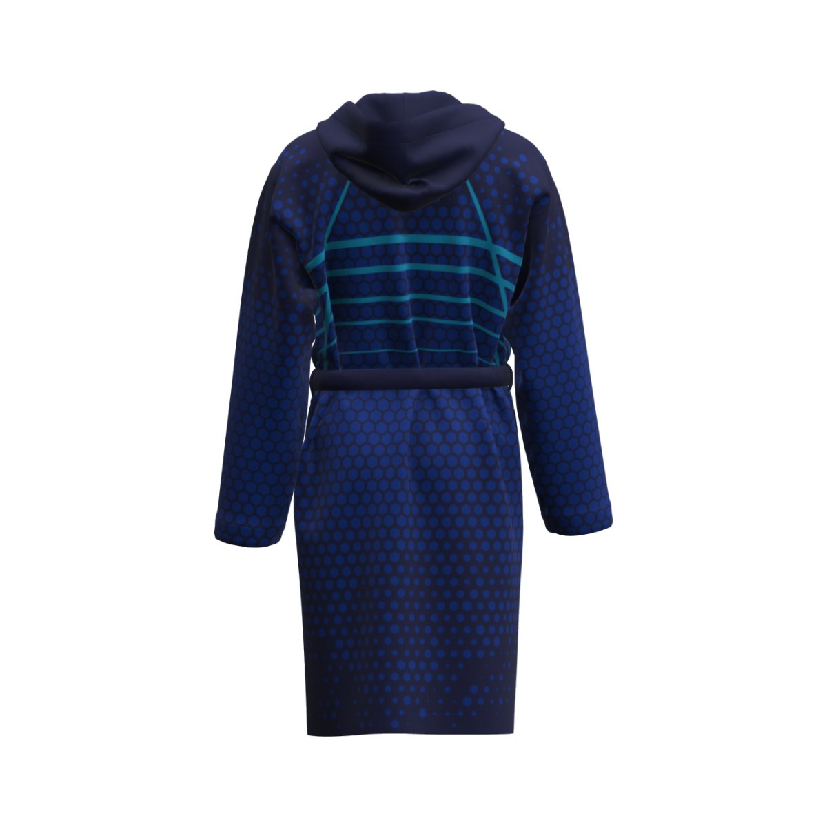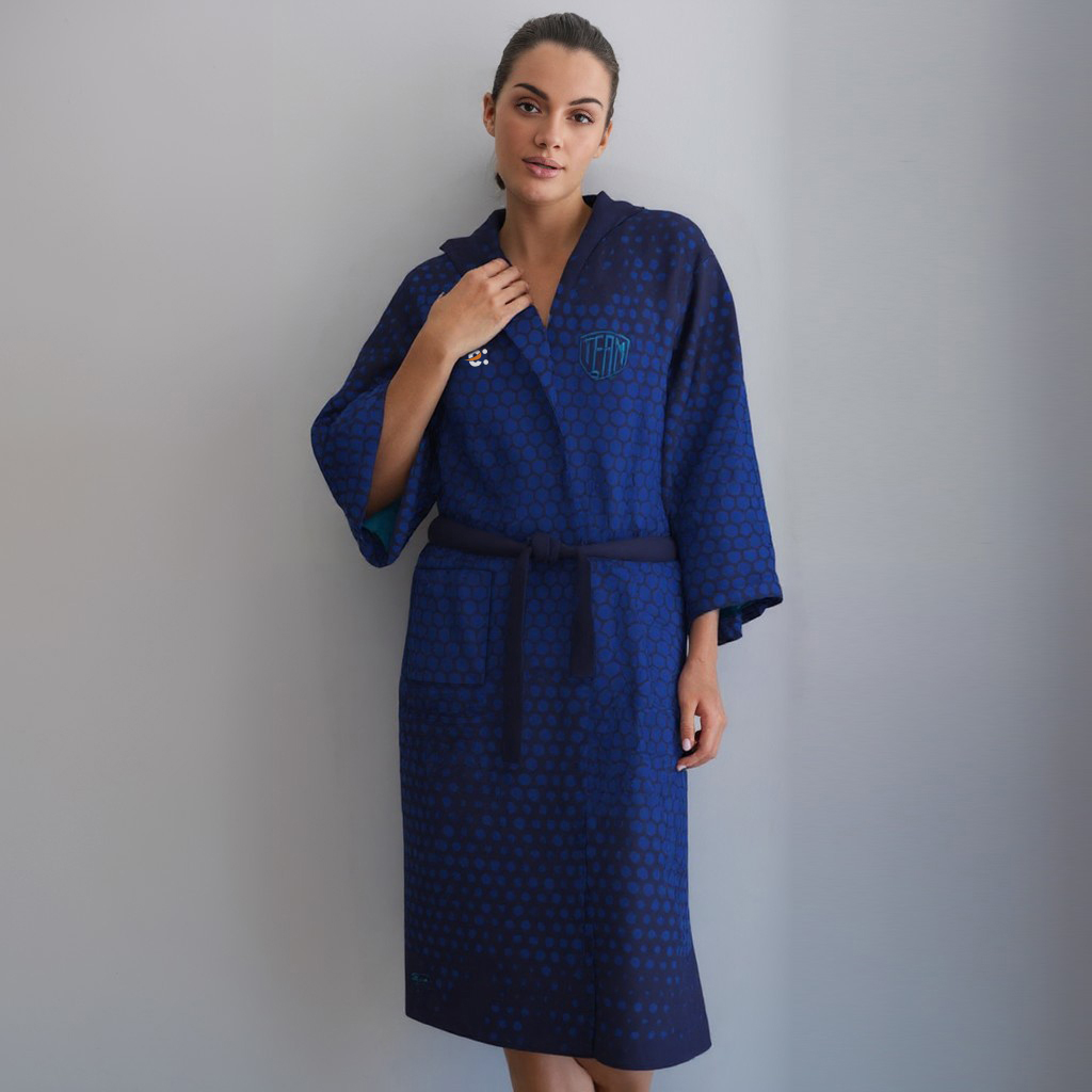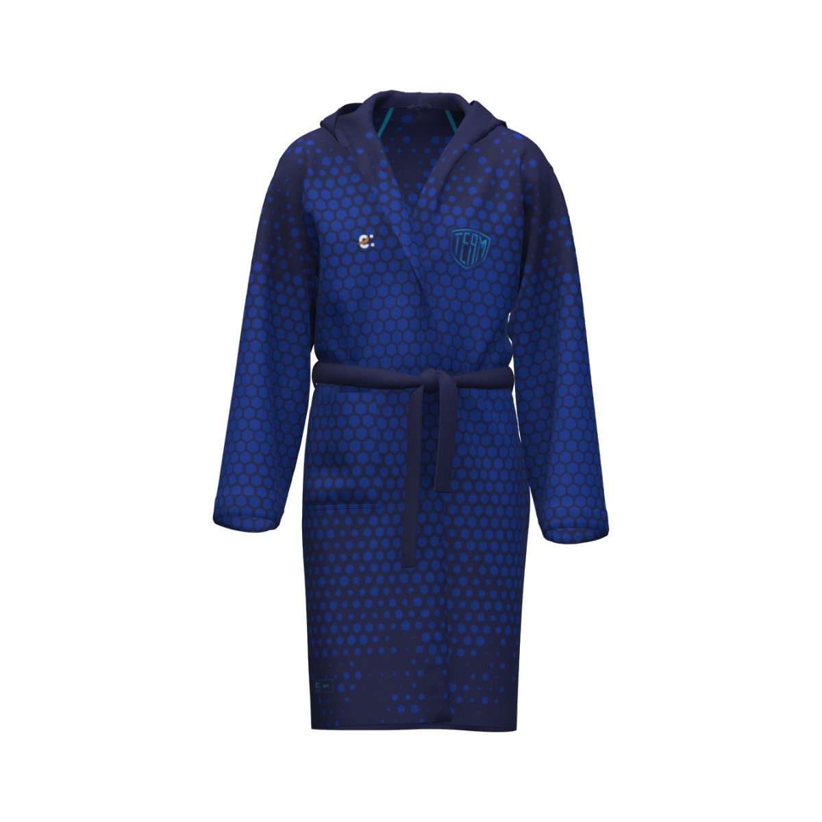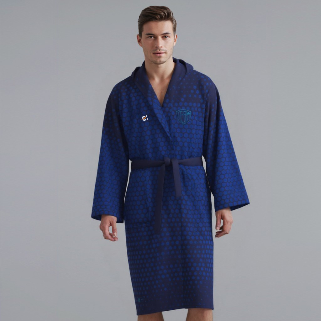 Accappatoio in sublimazione. Cinta con tre passanti. Una tasca frontale. Interno in cotone ed esterno in spugna velour stampabile. Tessuto: Velour 300. 50% cotone 50% poliestere velour. 300 grammi. Taglie: 4XS3XS – 2XSXS – SM – LXL – 2XL3XL – 4XL