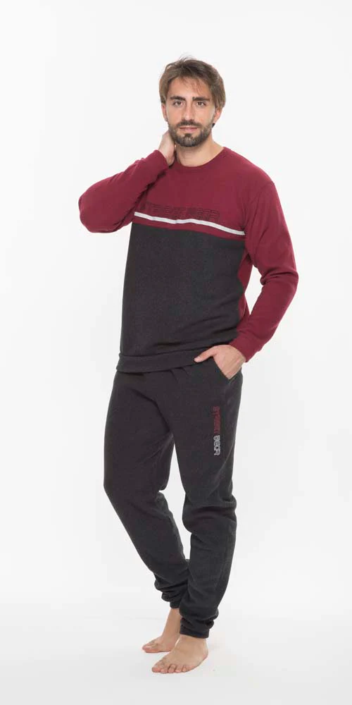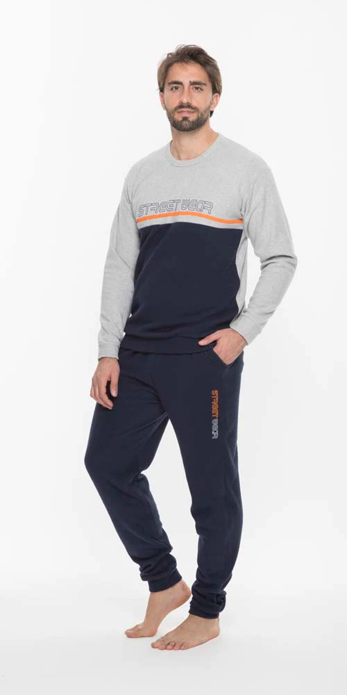 Gary Pigiama tipo tuta Uomo in punto milano. Maglia tinta unita con stampa ed elastico sotto, pantalone tinta unita con tasche, stampa e bordo alle caviglie. Proposta sportiva adatta ad un utilizzo frequente. Morbida e calda utile per le giornate fredde. Made in Italy.