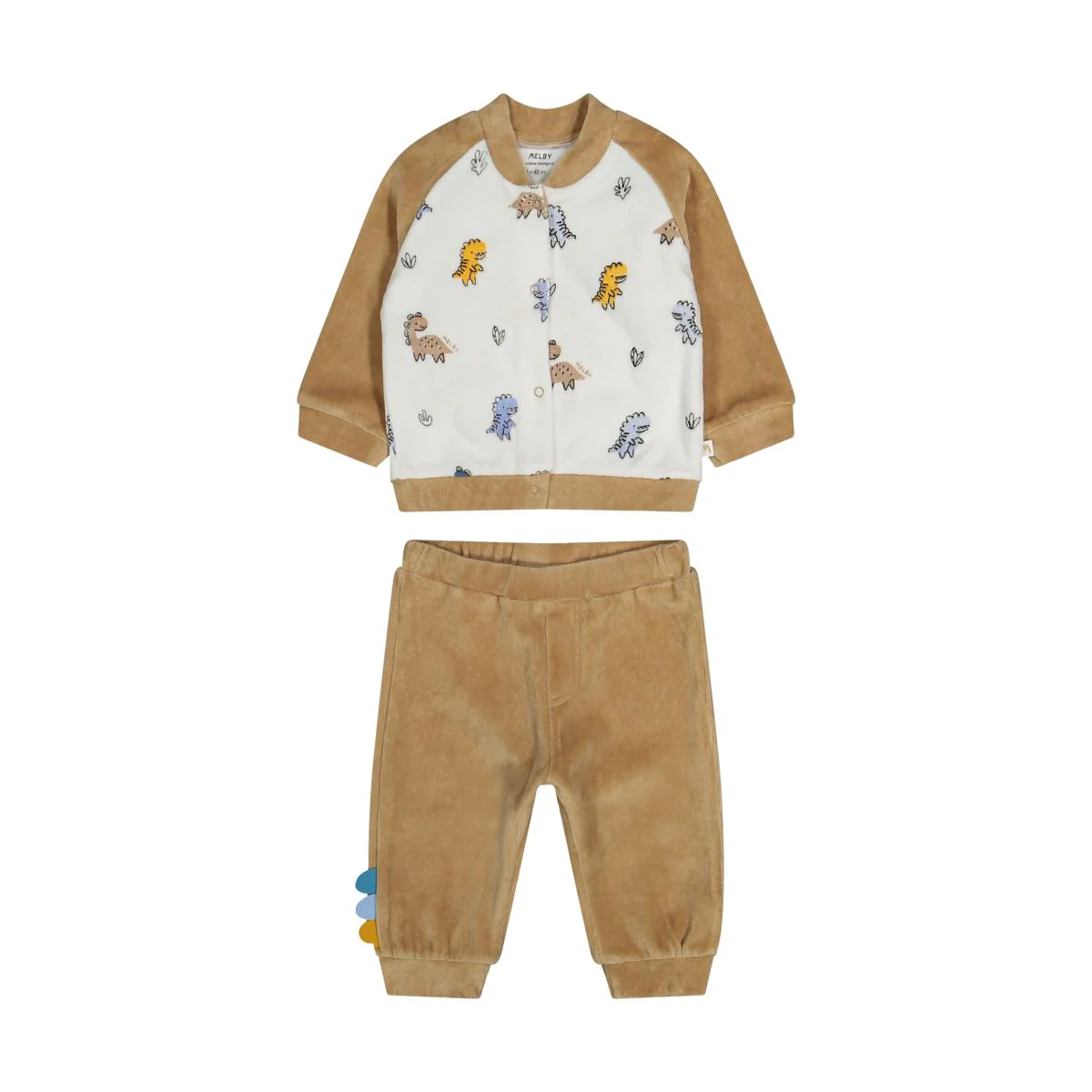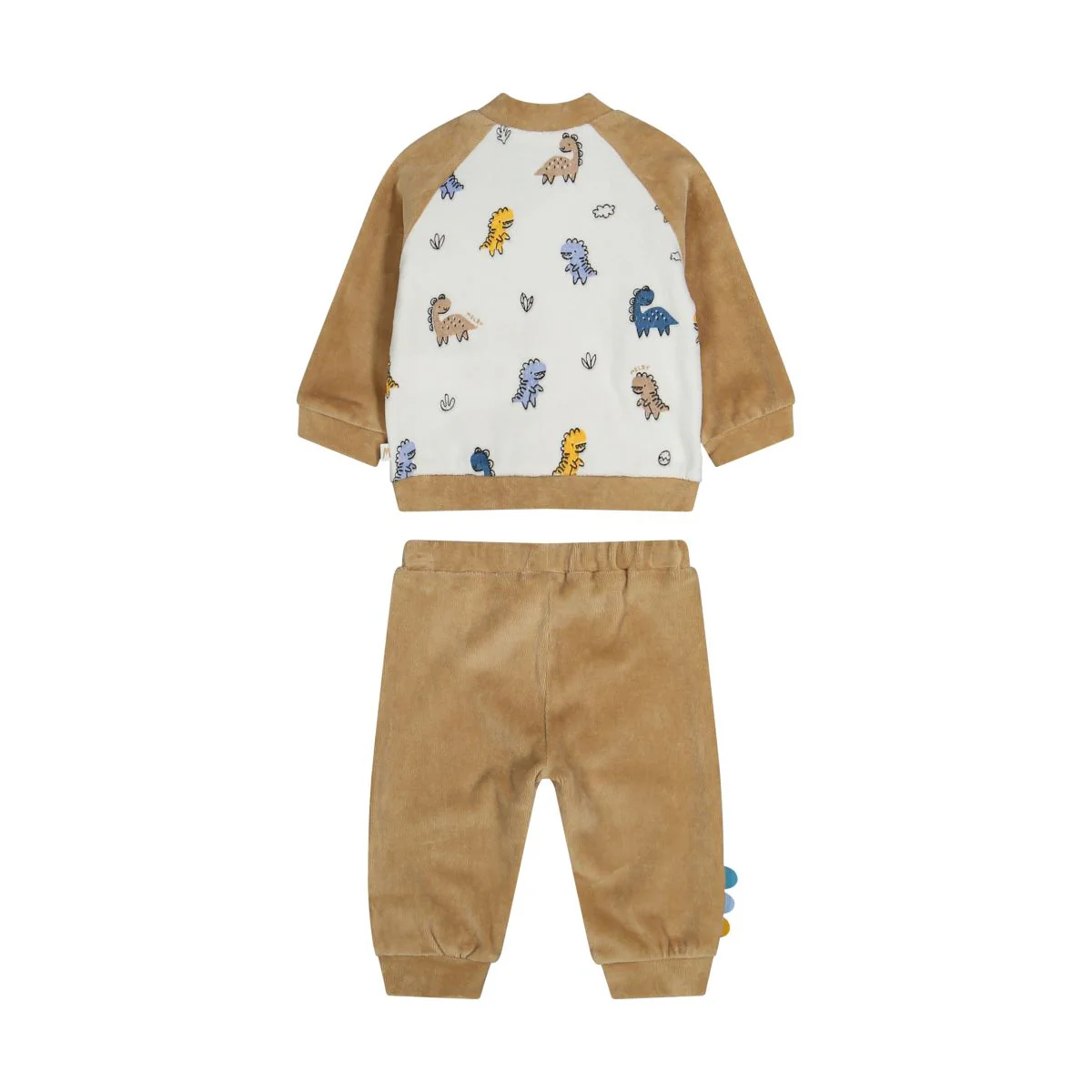 Completo in ciniglia 100% cotone bio per neonato Completo per neonato, realizzato in ciniglia 100% cotone bio e composto da una maglia con bottoncini a pressione e maniche raglan, colletto stile bomber e divertente stampa frontale. un pantalone con fondo gamba in costina e simpatico effetto cresta di dinosauro in rilievo