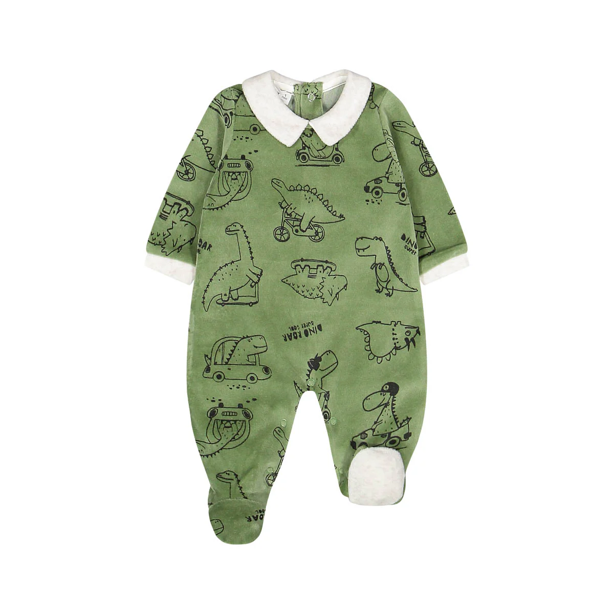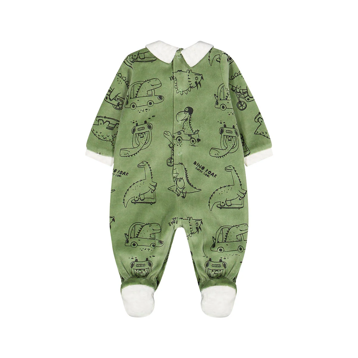 Il modello dai colori innovativi รจ caratterizzato da colletto e polsini a contrasto, con dei teneri dinosauri stampati e apertura con pratici bottoncini a pressione nella parte posteriore del capo.