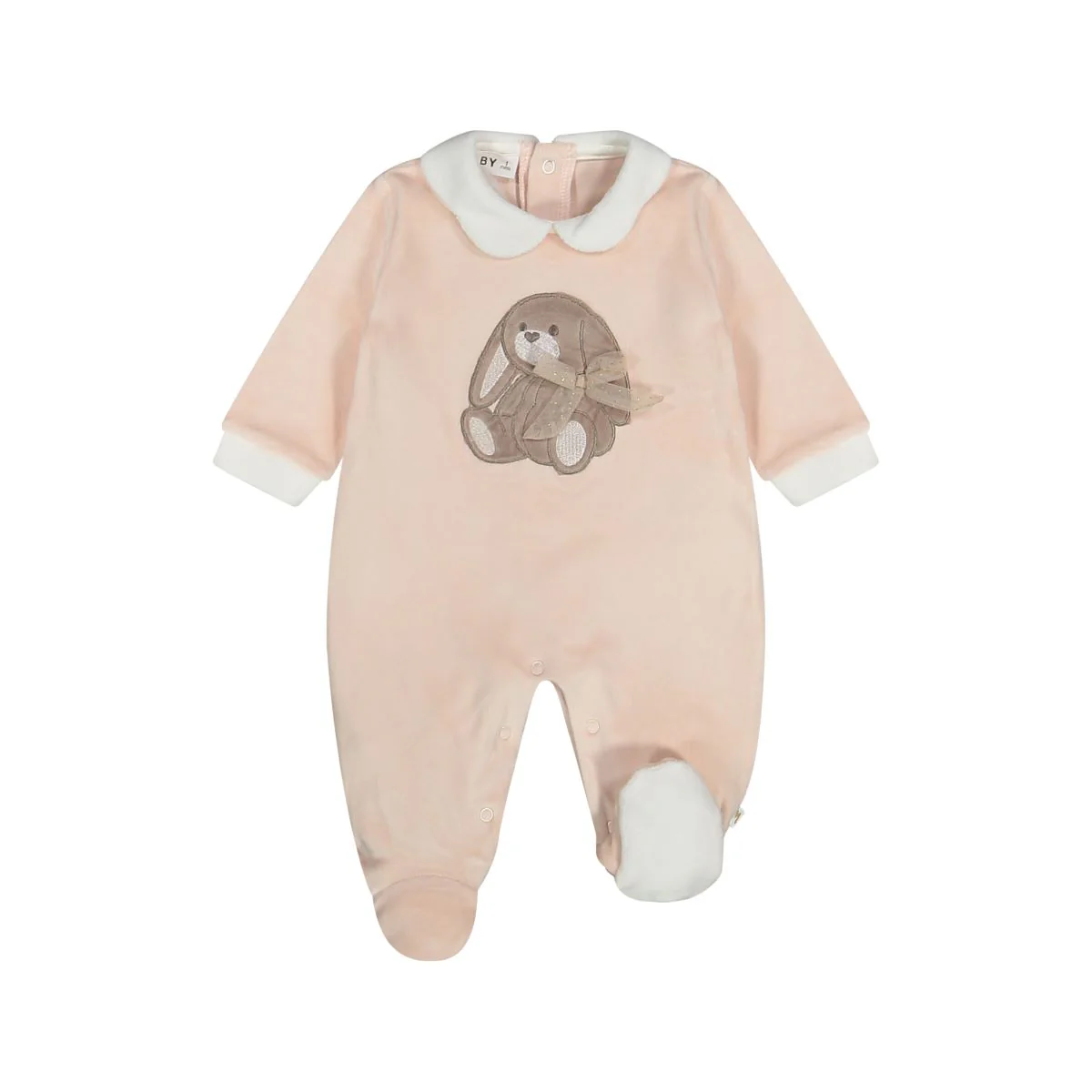 Nella parte frontale grazioso coniglietto ricamato con fiocco luccicante applicato.