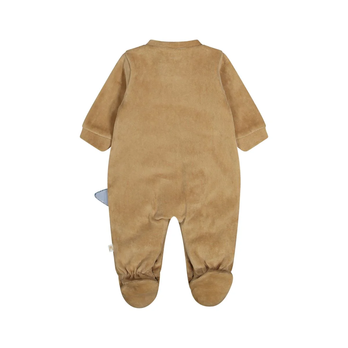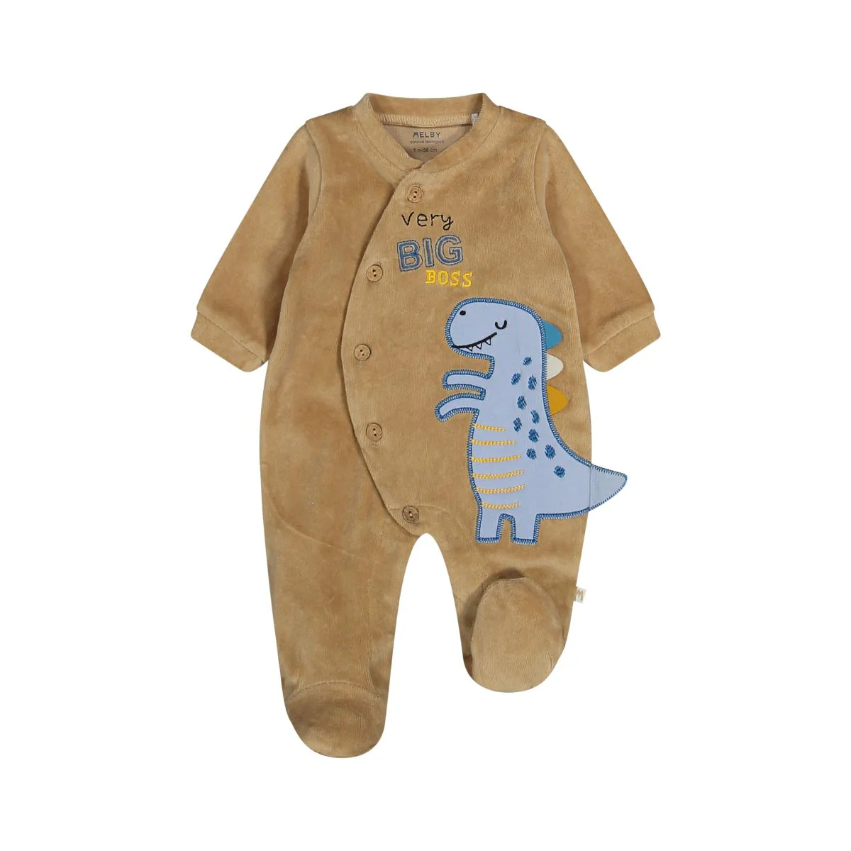 Collezione Baby by MELBY Tutina con piede in morbida ciniglia 100% cotone bio per neonato Tutina girocollo con apertura frontale e nell’interno gambe, realizzata in morbida ciniglia 100% cotone bio. Spiritoso dinosauro ricamato sul lato sinistro in contrasto di colore.