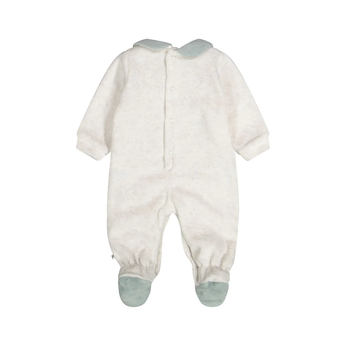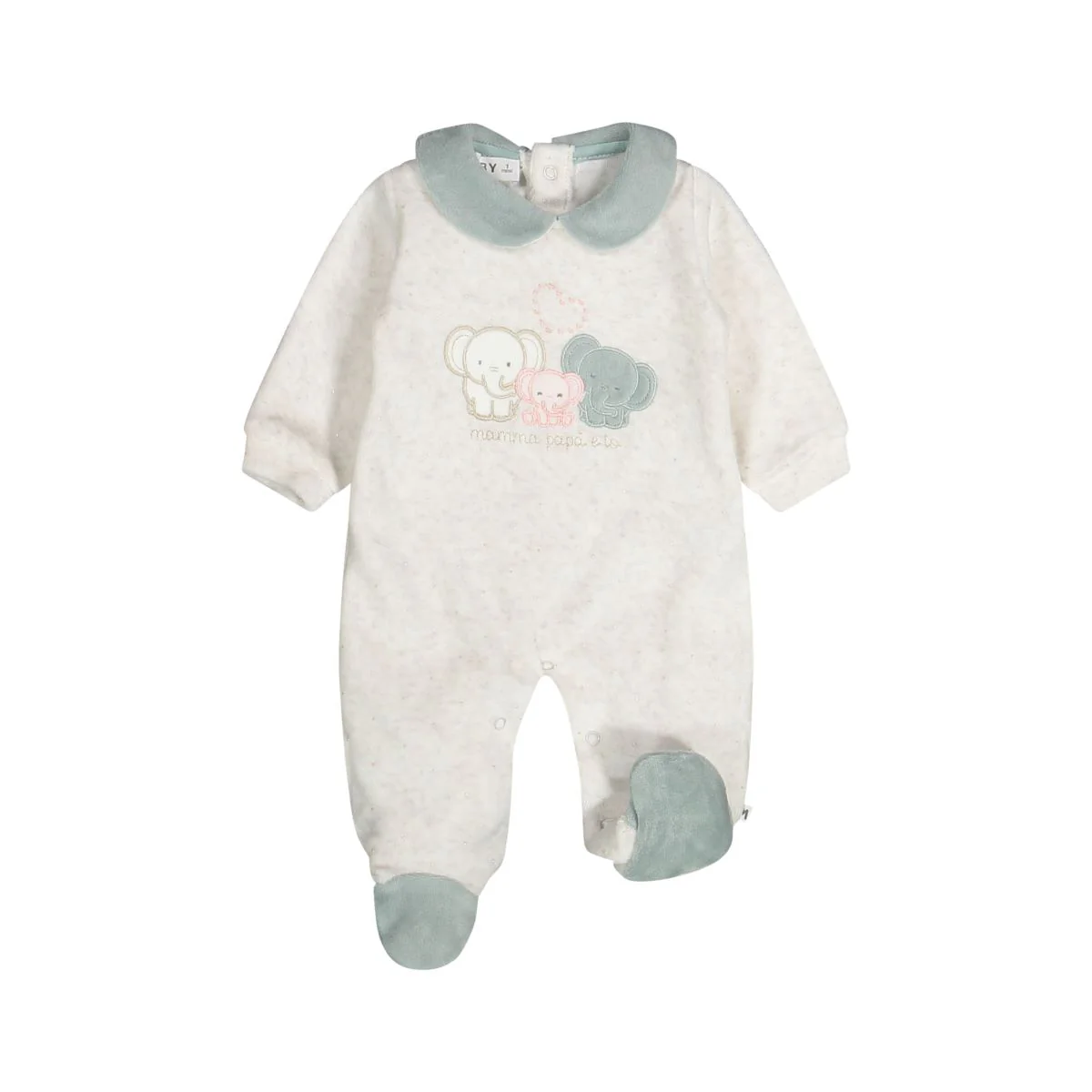 Il colletto rotondo e i piedini sono in contrasto di colore, mentre il lato frontale รจ impreziosito da un tenero ricamo raffigurante degli elefantini.